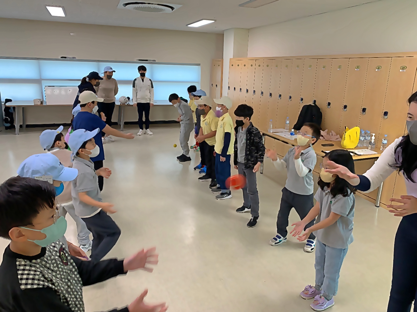 집중도와 협동심을 길러주기 위한 게임인 공을 땅에 안떨어뜨리고 주고받는 것을 하고 있는 아이들