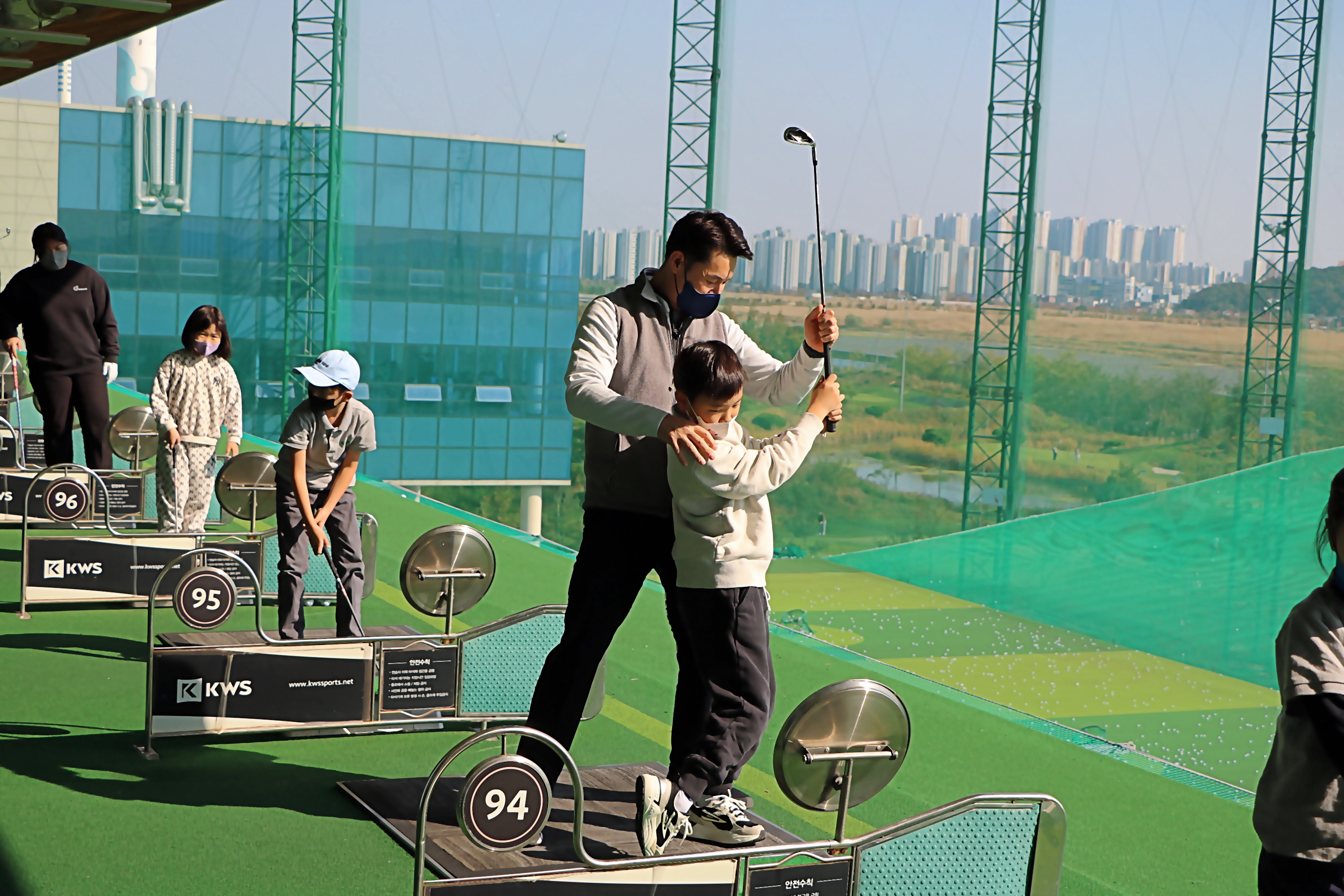 아이들이 보다 정확한 피니쉬 동작을 취할 수 있도록 도움을 주고 있는 코치