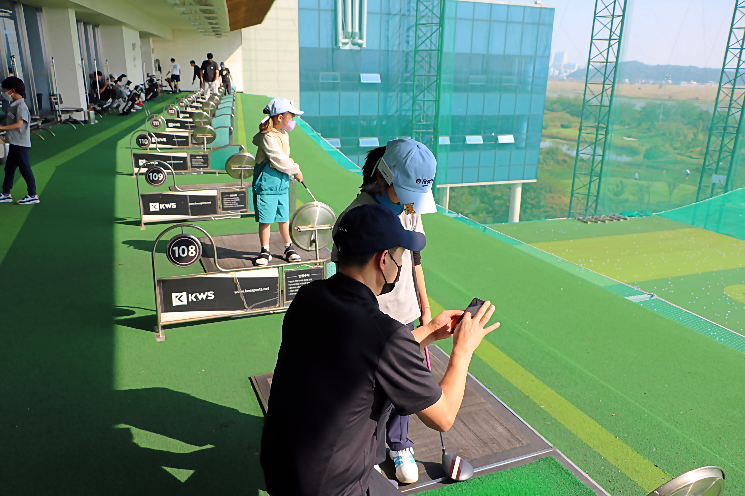 선수지망생인 교육생을 위해 핸드폰으로 스윙을 촬영한 후 함께 보며 보다 정확한 스윙분석을 해주고 있는 모습