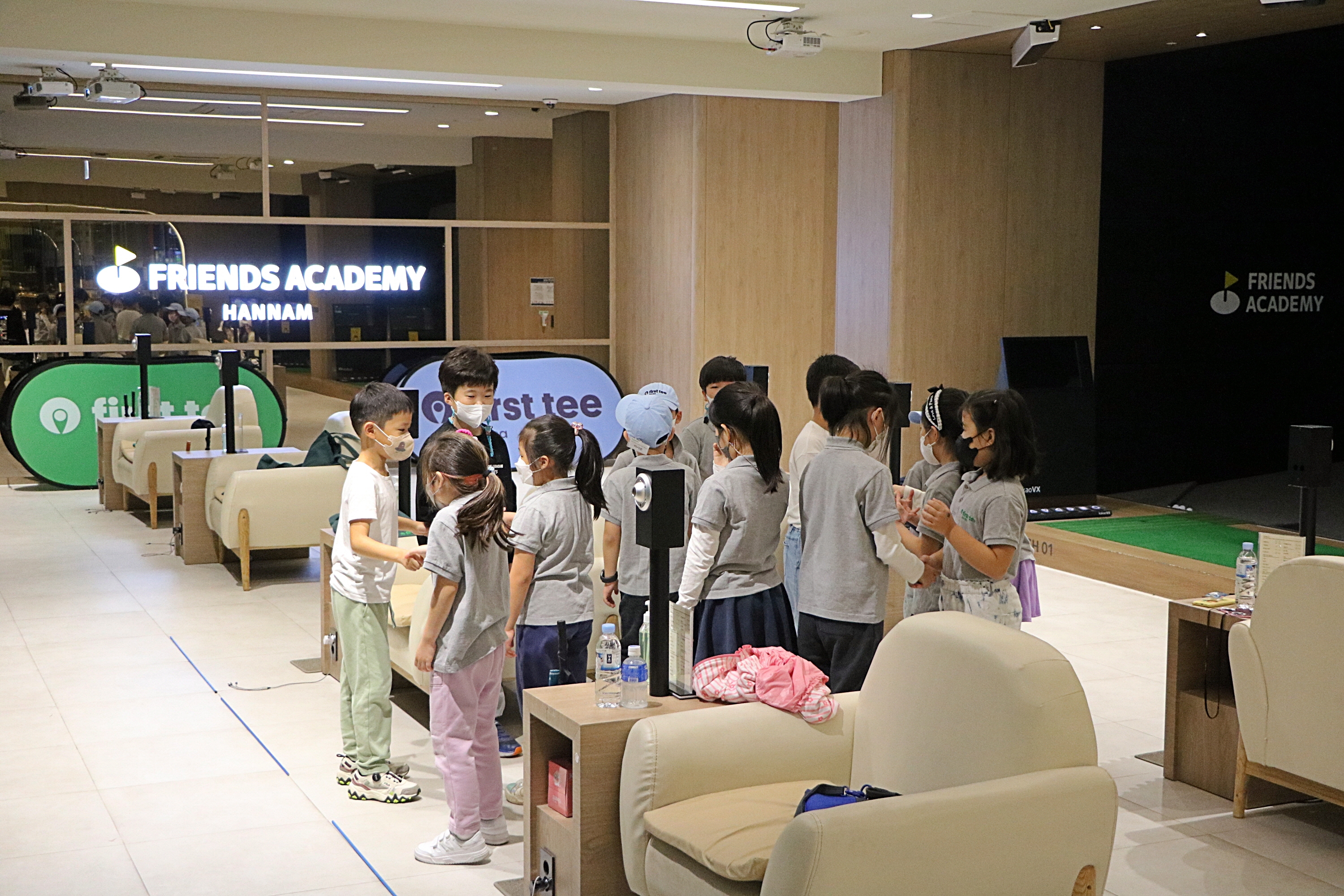 남, 녀 퍼팅대결 후 서로 악수를 하며 스포츠맨십을 실천하는 아이들