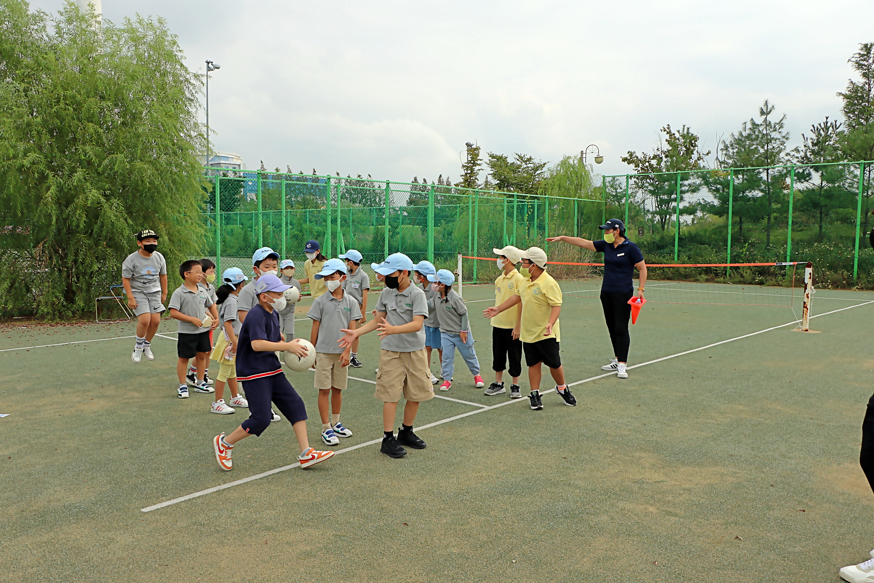협동심 등을 키우기 위해 배구공 전달하기를 하면서 몸을 풀고 있는 아이들