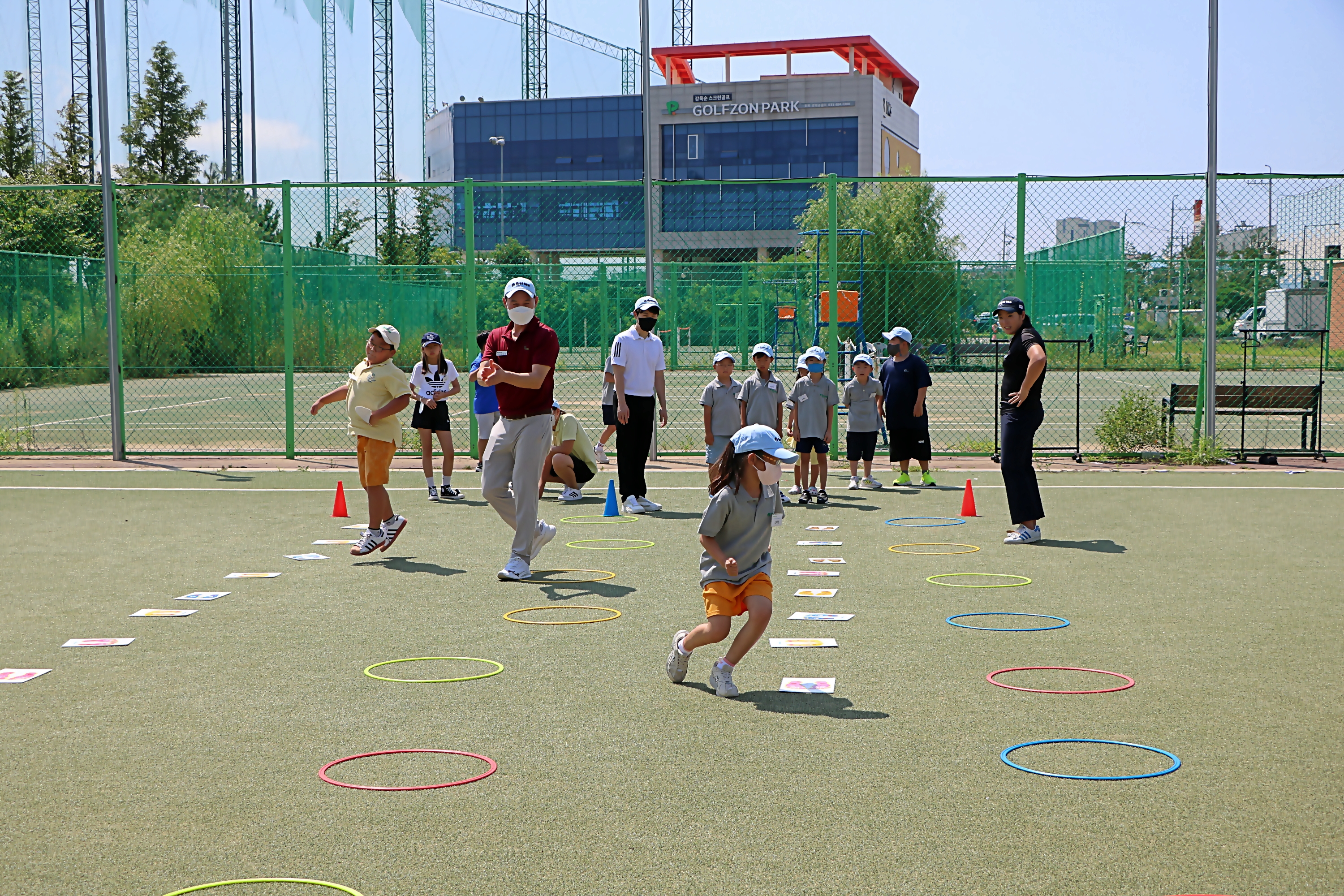 바닥에 놓인 발모양대로 몸을 움직이며 몸풀기를 하고 있는 모습