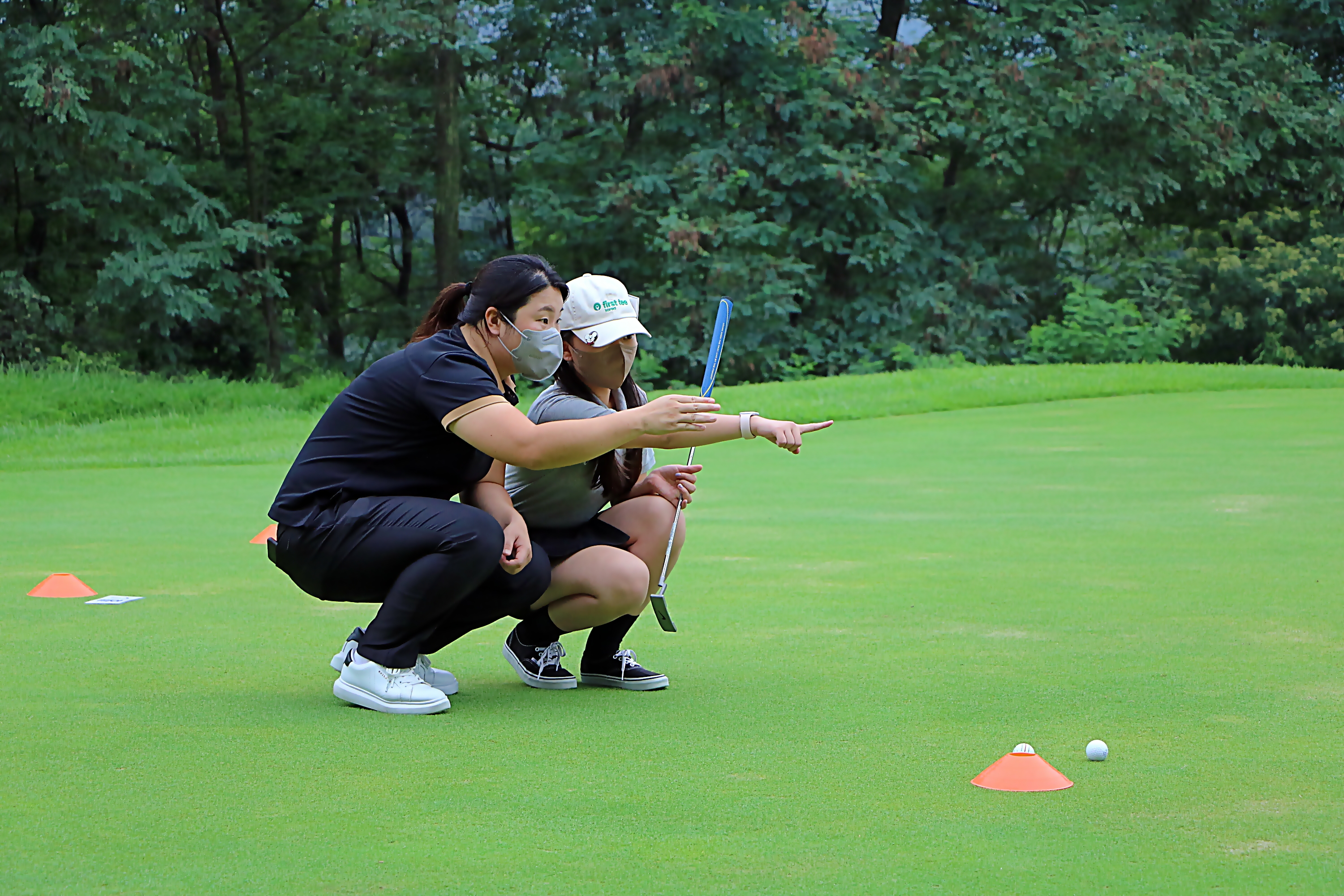 코치님께 퍼팅목표설정방법에 대해서 진지하게 배우고 있는 모습