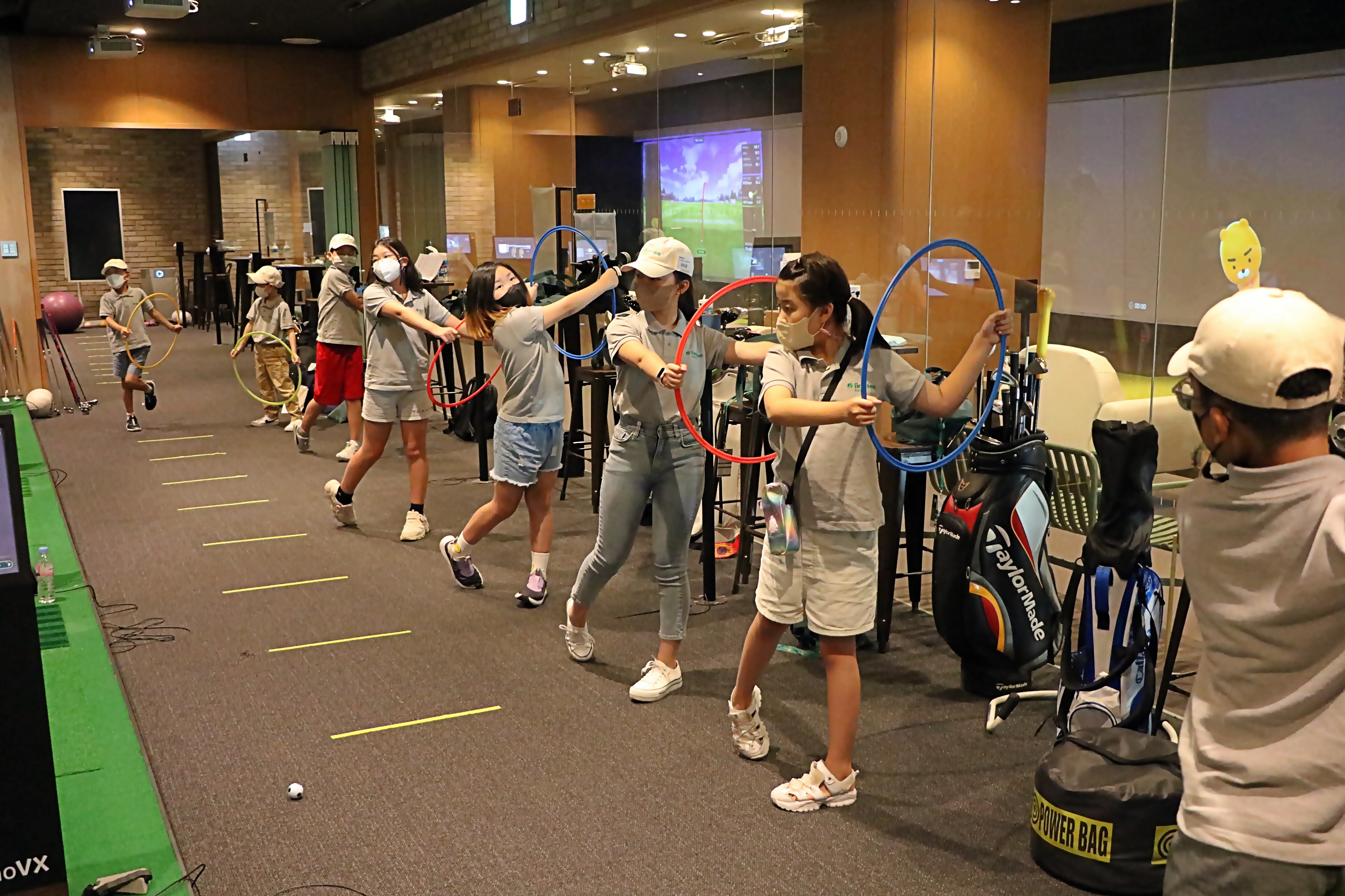 훌라후프를 이용해 스윙시 필요한 몸통회전 요령에 대해 가르쳐 주고 있는 모습