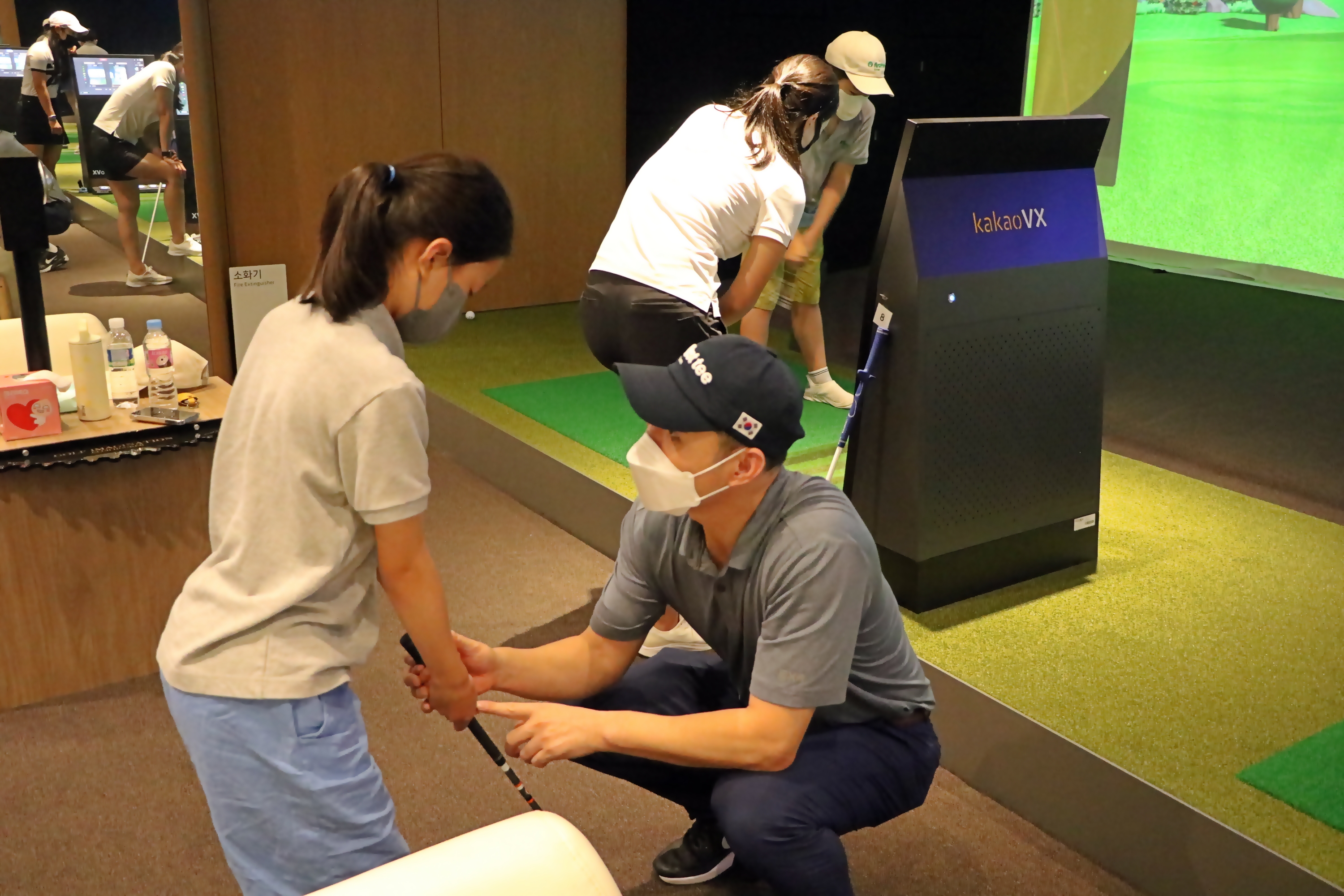 잠시 쉬는 동안에도 스윙의 가장 기본 동작인 그립잡는 법에 대해서 설명해 주고 있는 모습