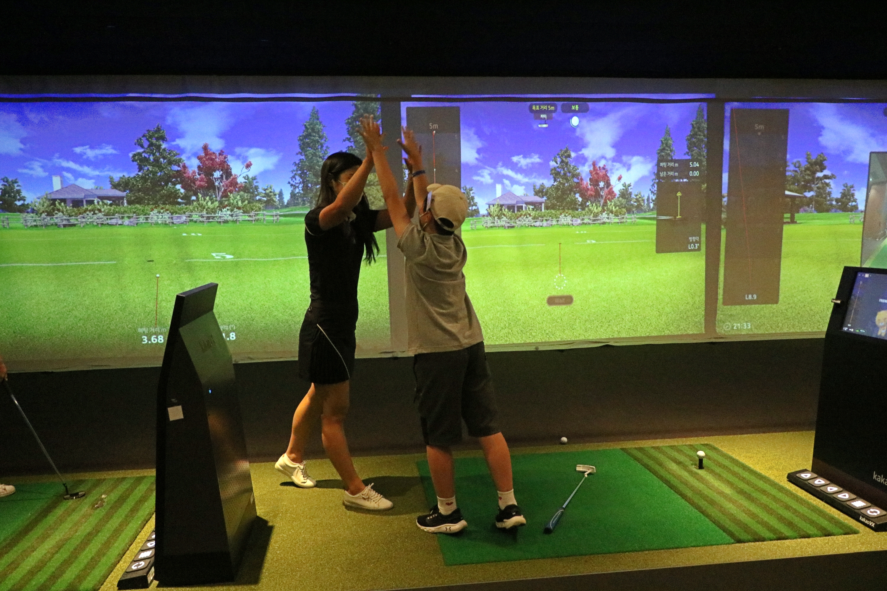 5m 퍼트에 성공한 뒤 코치님과 하이파이브를 하며 즐거워하는 모습