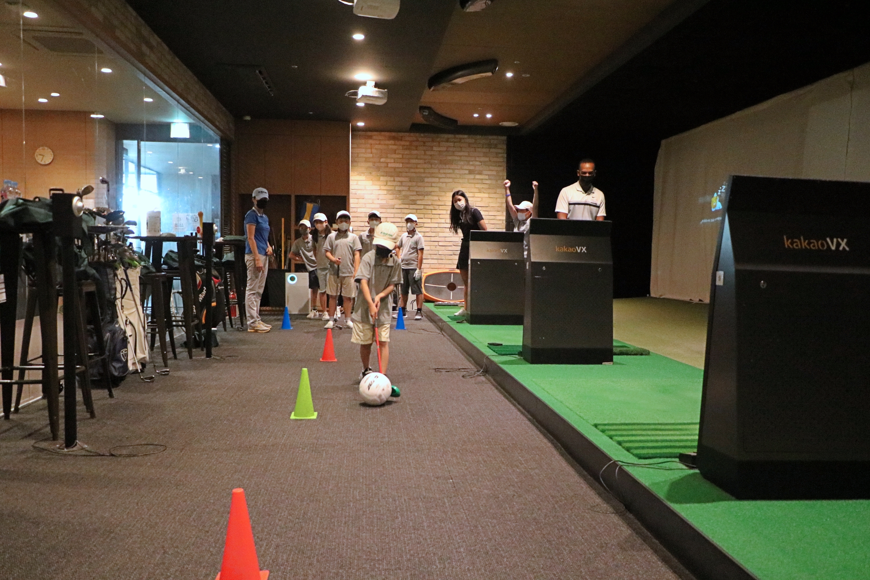 간단한 게임을 통해 골프클럽과 공에 대한 친숙도를 높이고 있는 아이들