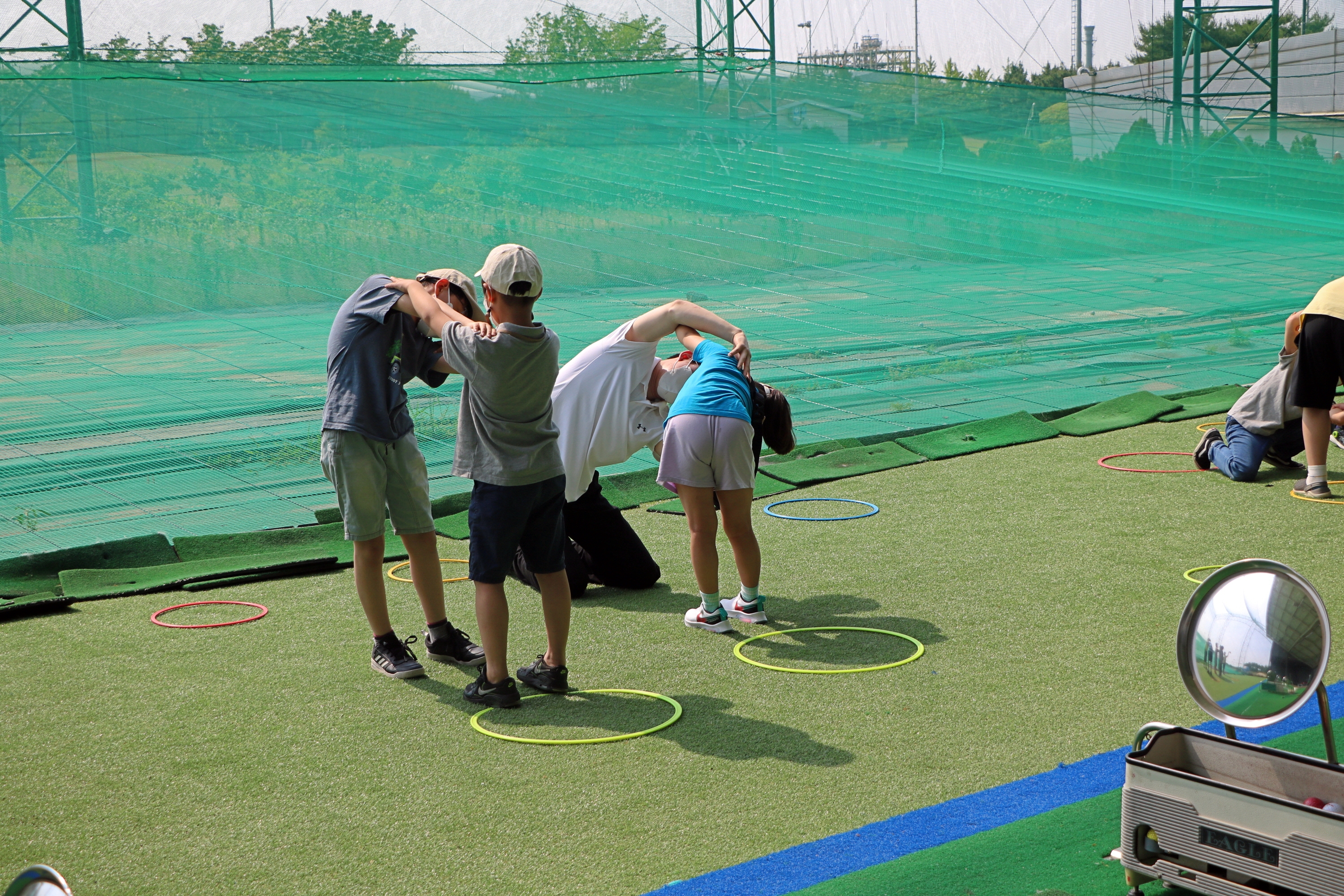 2인 1조로 어깨누르기를 하며 몸을 풀고 있는 아이들