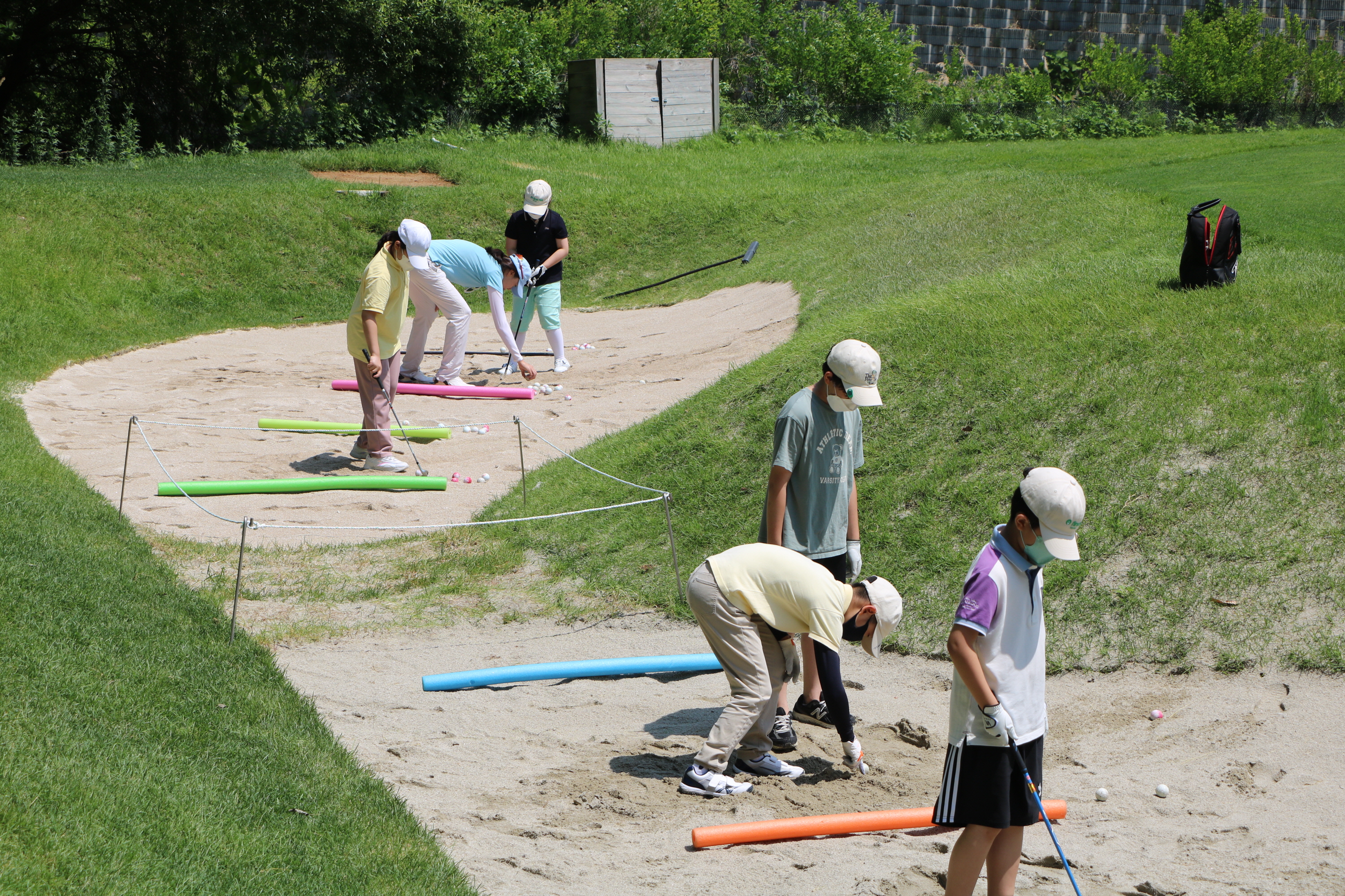골프실력이 뛰어난 한 교육생이 같은 조 동료에게 벙커샷 하는 요령을 가르쳐 주고 있는 모습