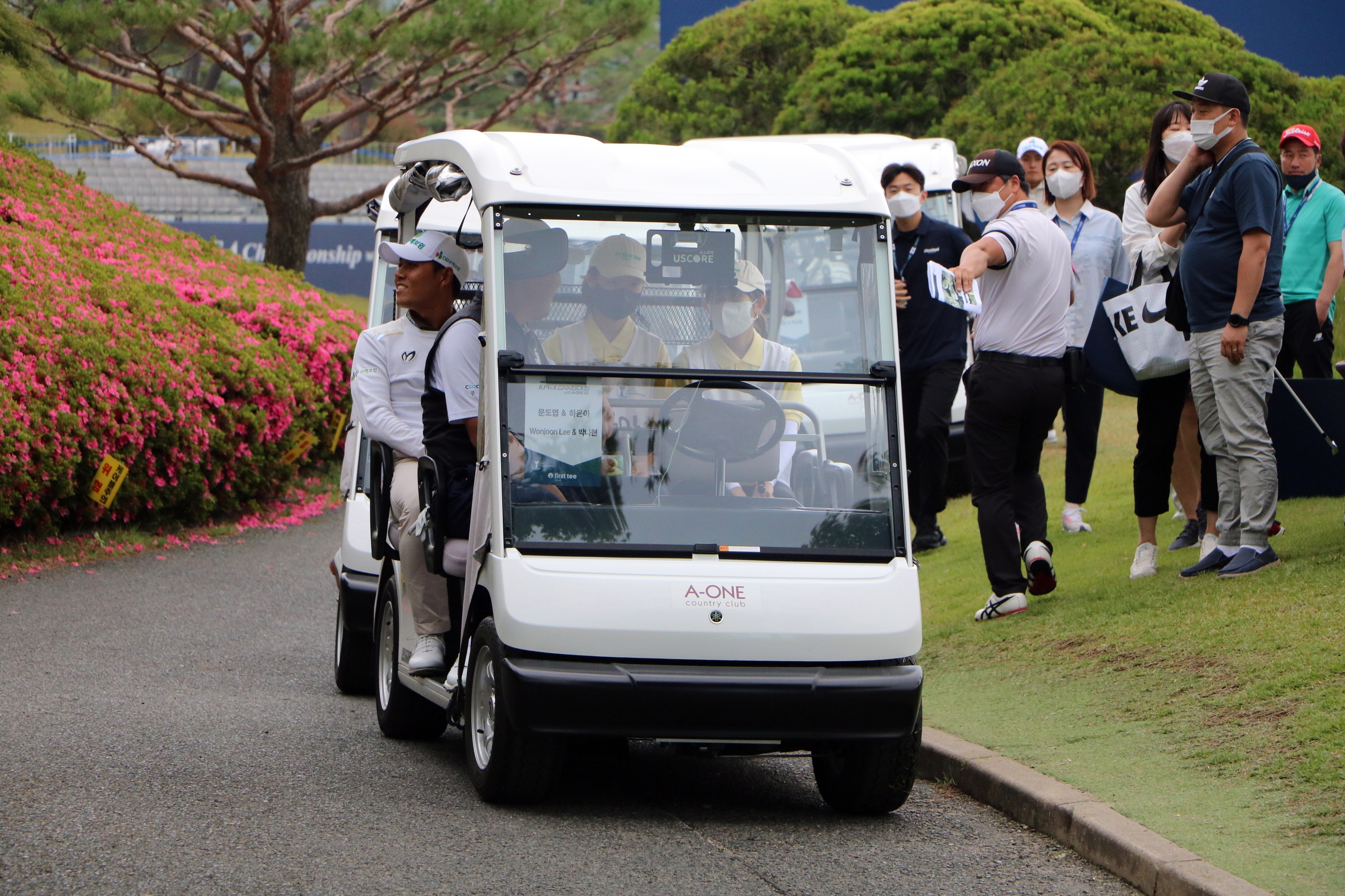 숏홀인 17번홀에서 카트를 타고 다음 플레이할 지점인 그린으로 이동하고 있는 모습