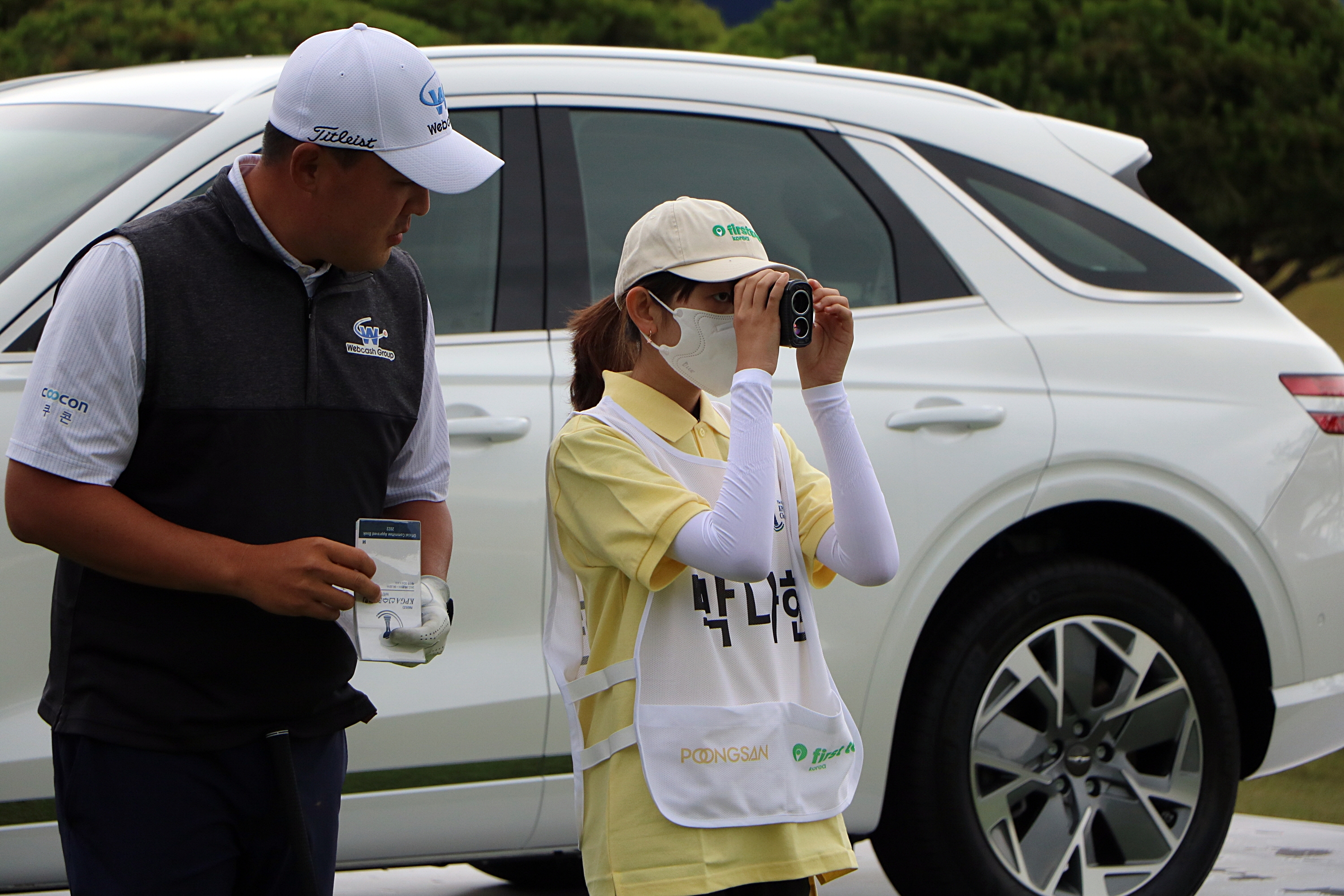 이원준 선수에게 핀까지 거리를 체크해 주고 있는 모습