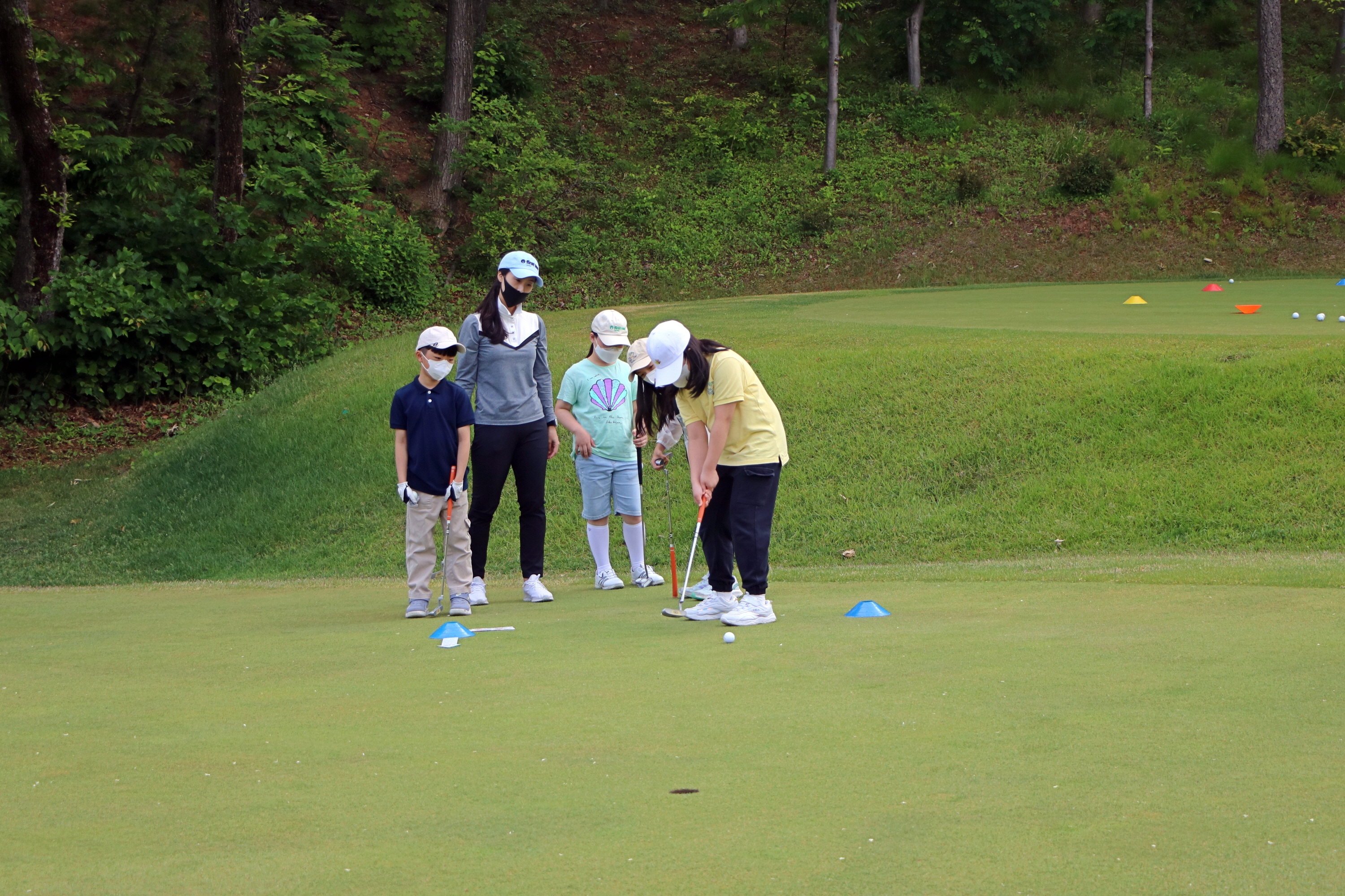 2인 1조로 한 팀이 되어 매치플레이 방식으로 퍼팅게임을 하고 있는 모습