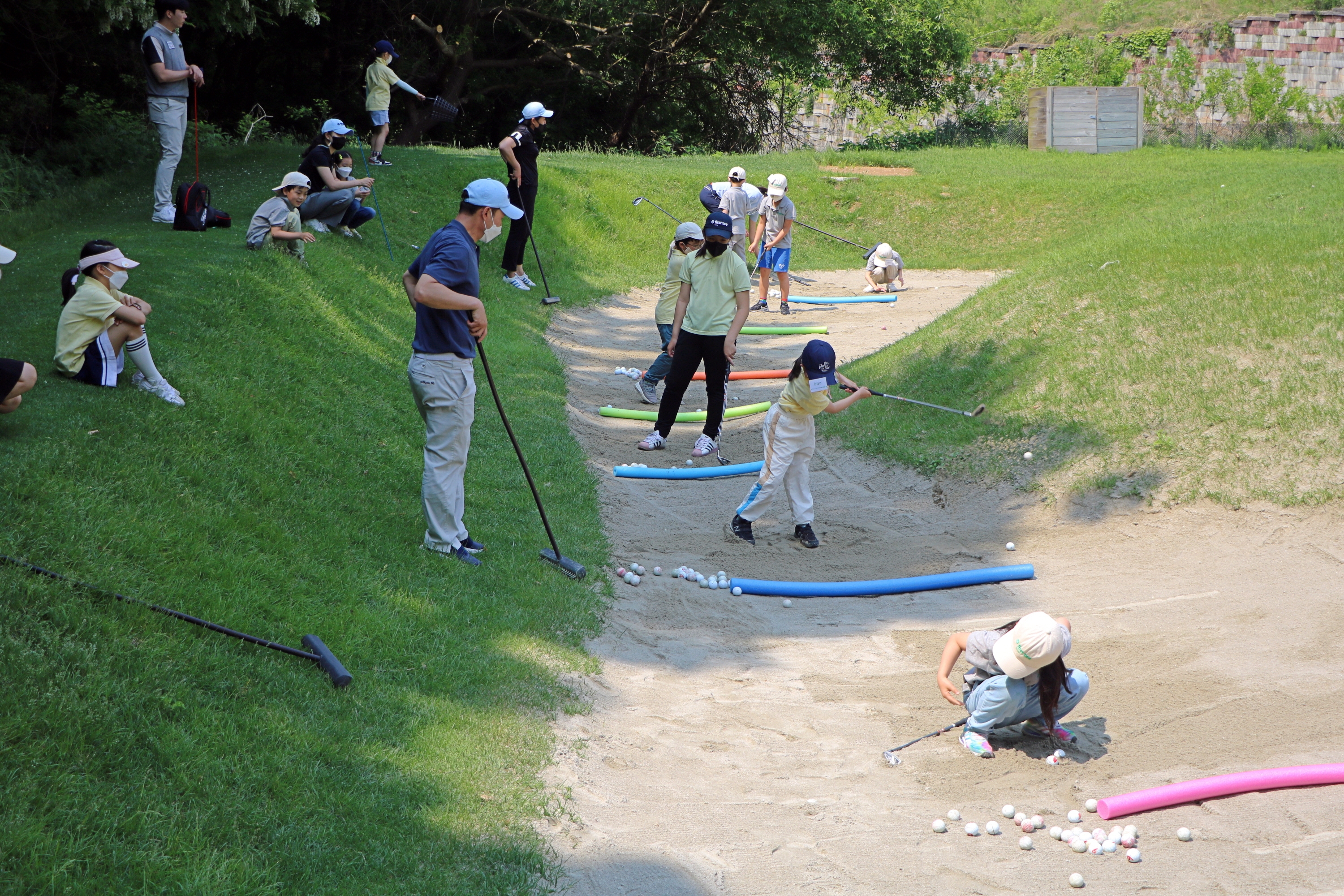 헤저드에 해당하는 벙커샷 실습을 하고 있는 아이들