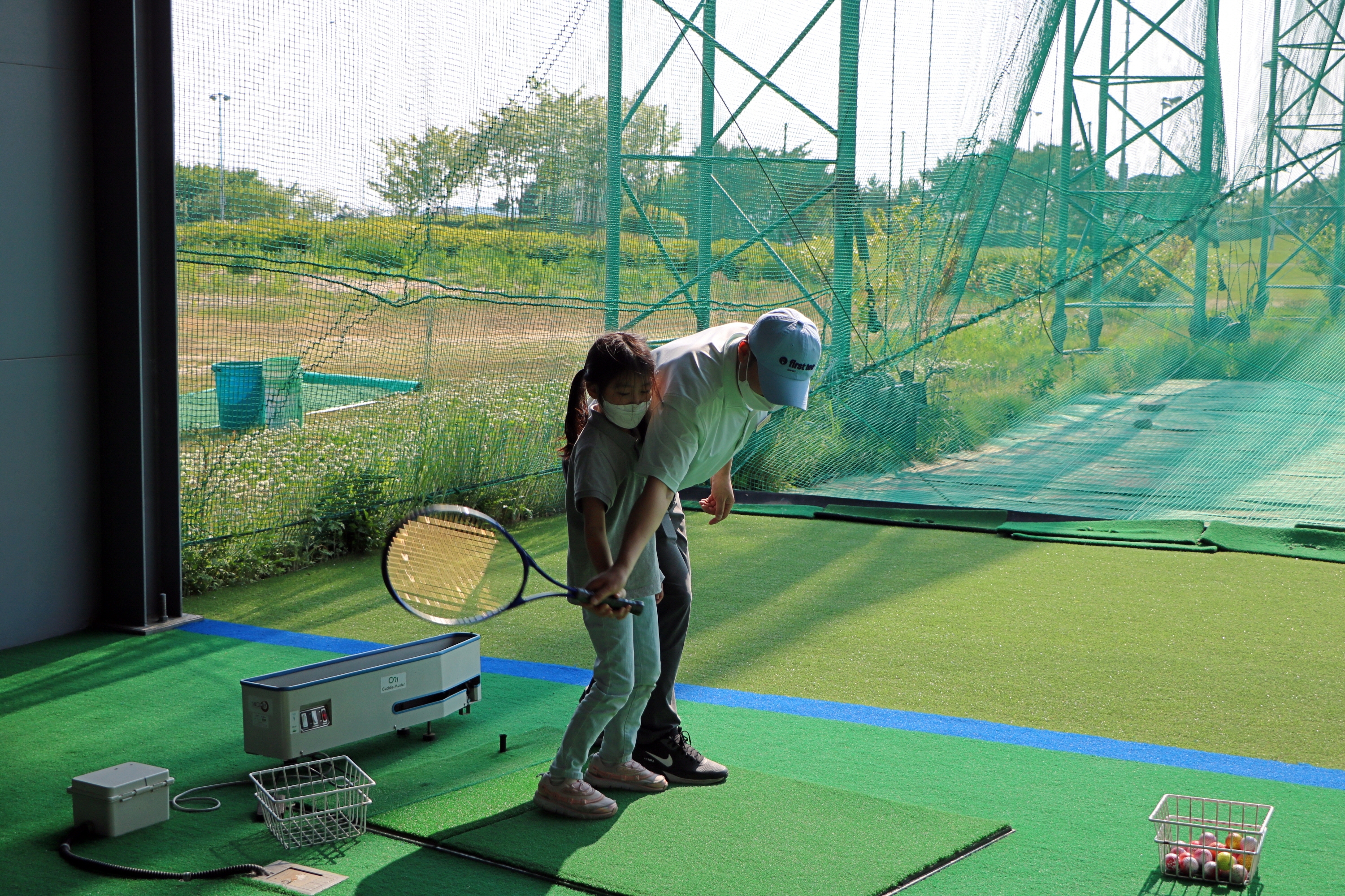 테니스 라켓을 활용해 클럽페이스 모양이 변화되는 모양을 설명해 주고 있는 모습