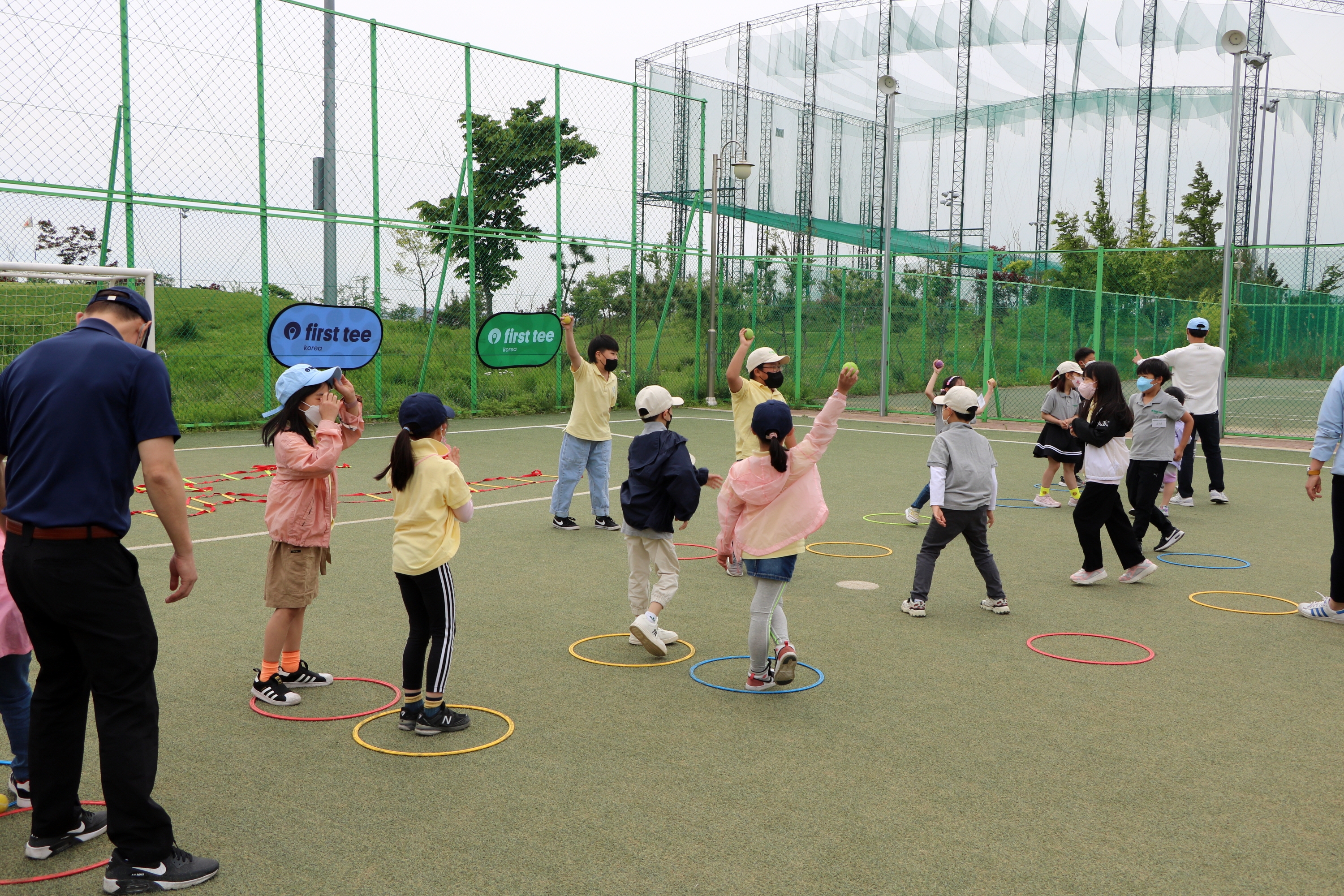 2인 1조로 등을 맞대고 서있다가 신호에 맞춰서 공을 빨리 집는 게임을 하고 있는 아이들