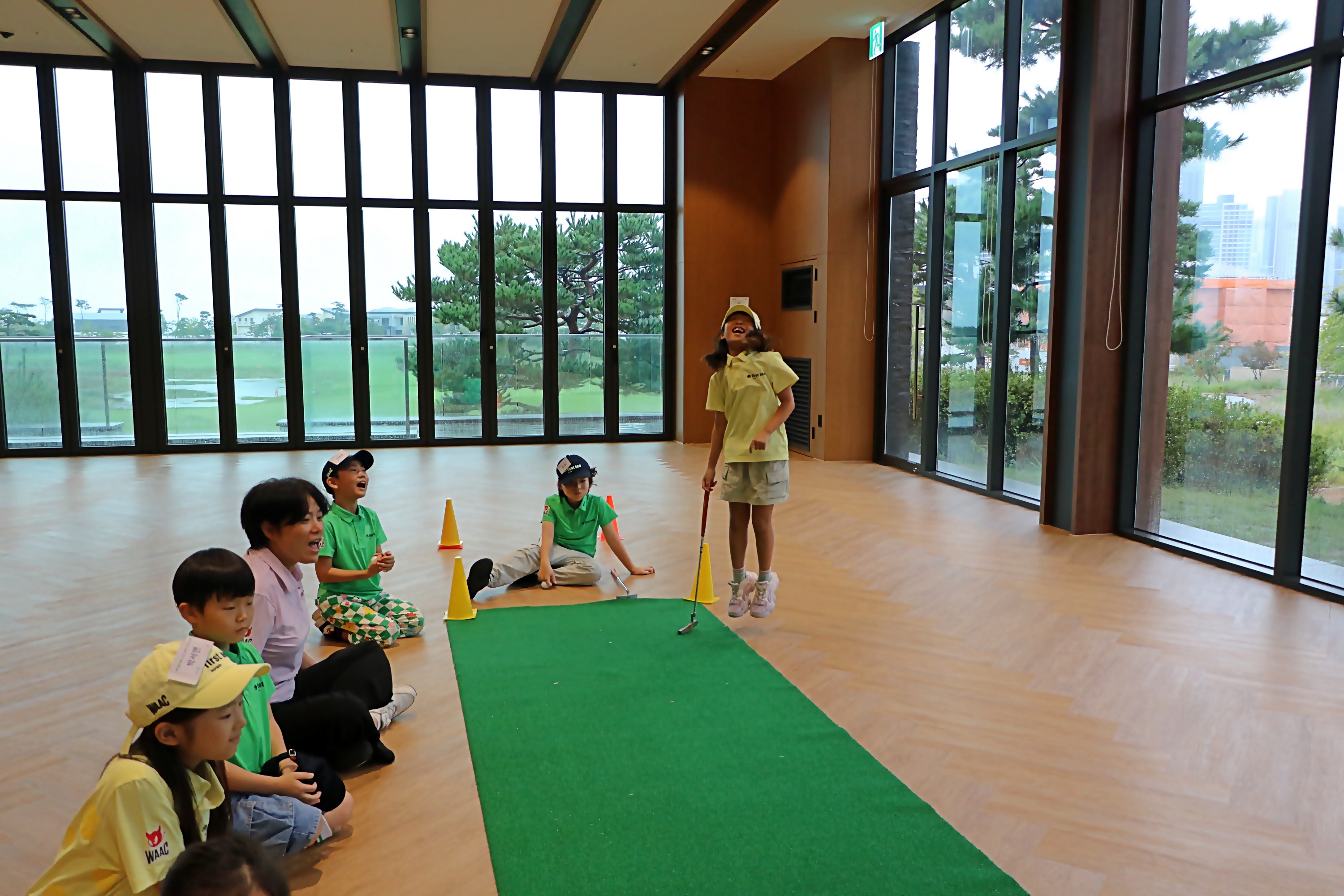 퍼팅 연습을 하며 자신이 친 볼이 목표에 명중하자 기뻐하는 교육생