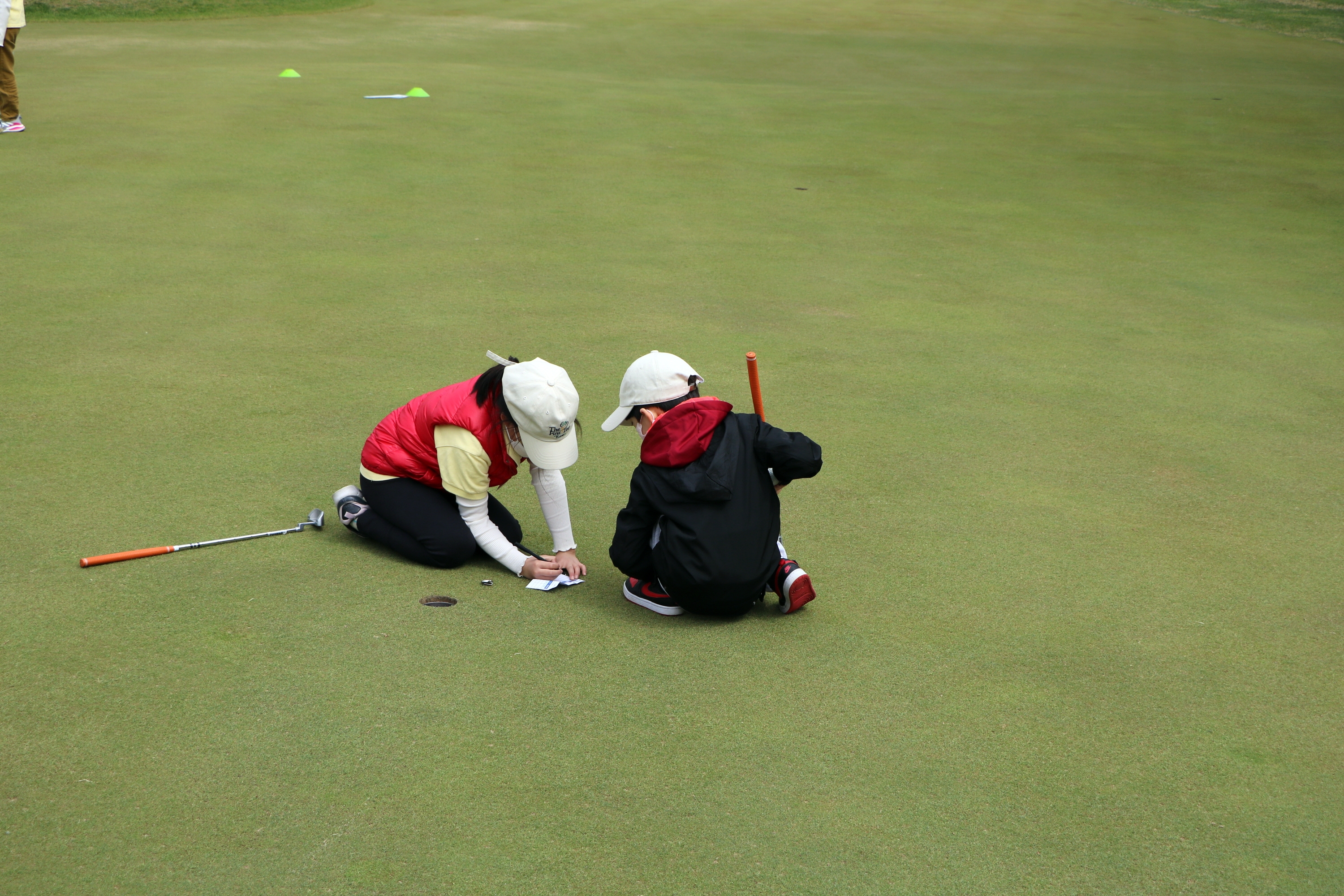 버디를 기록한 후 곧바로 그린 위에서 스코어카드를 기록하고 있는 모습