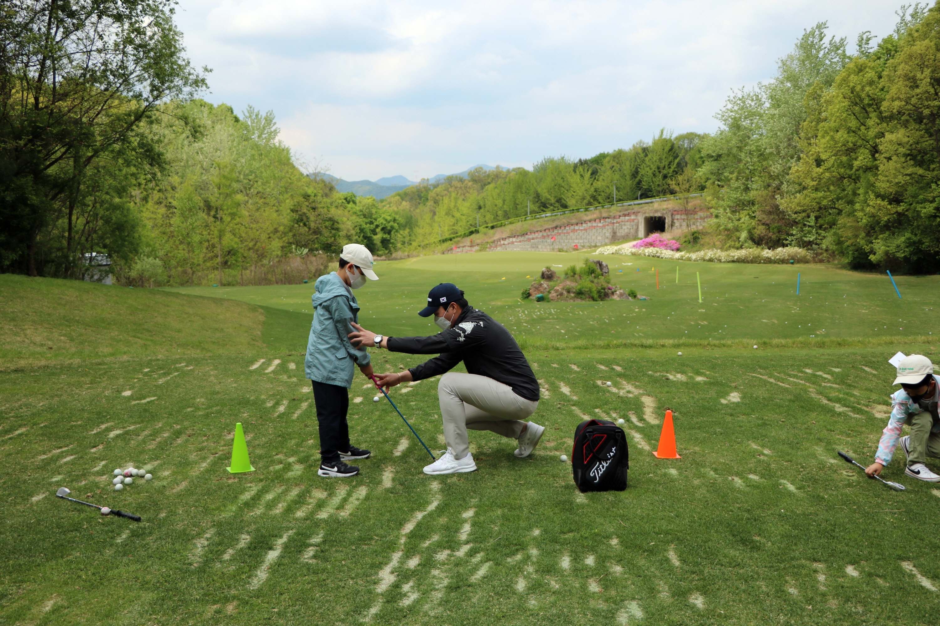 1:1로 각 교육생에 맞게 어드레스 자세를 교정해 주고 있는 모습