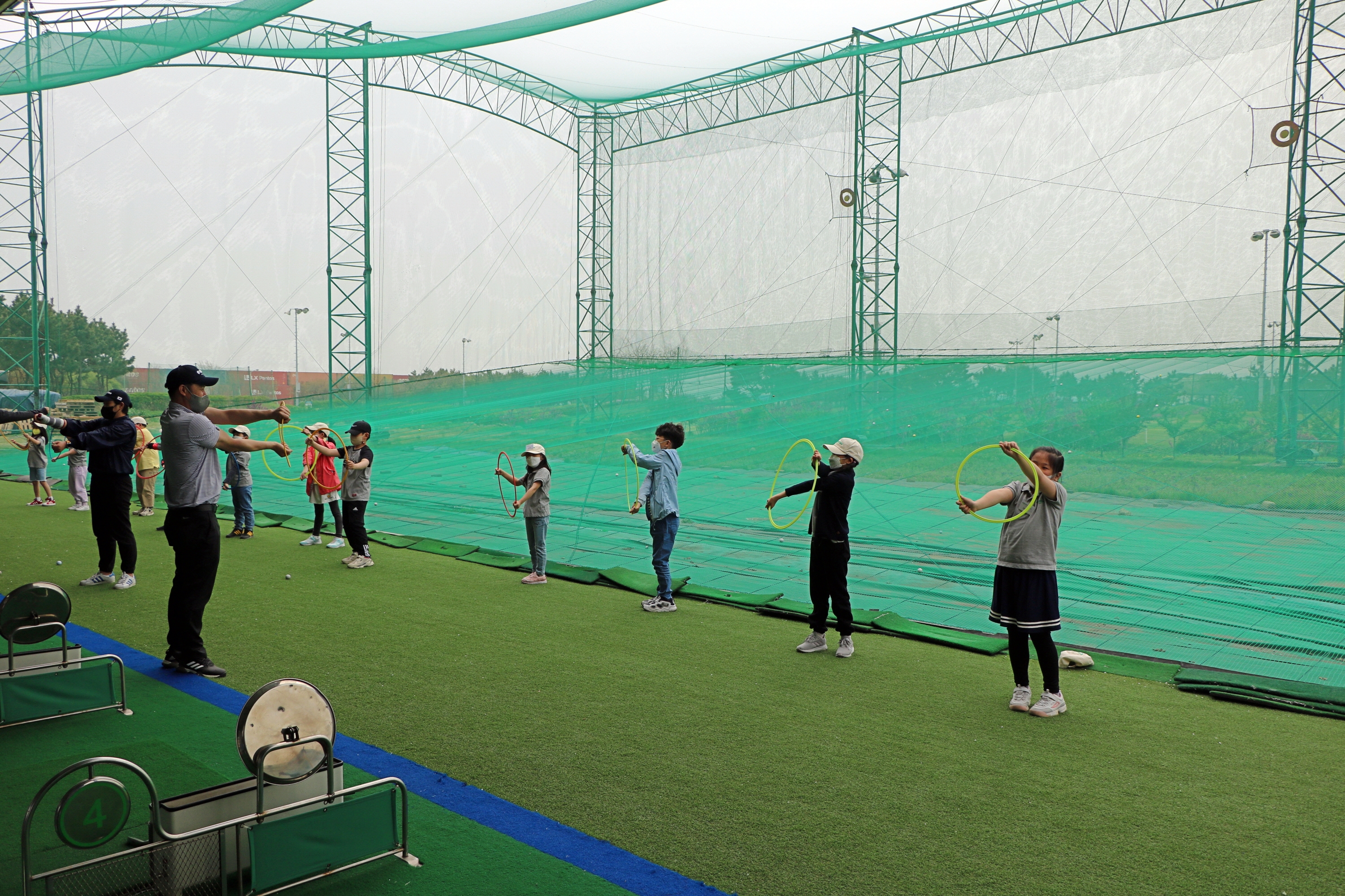 코치님을 따라 본격적인 골프실습에 앞서 몸풀기를 하고 있는 아이들
