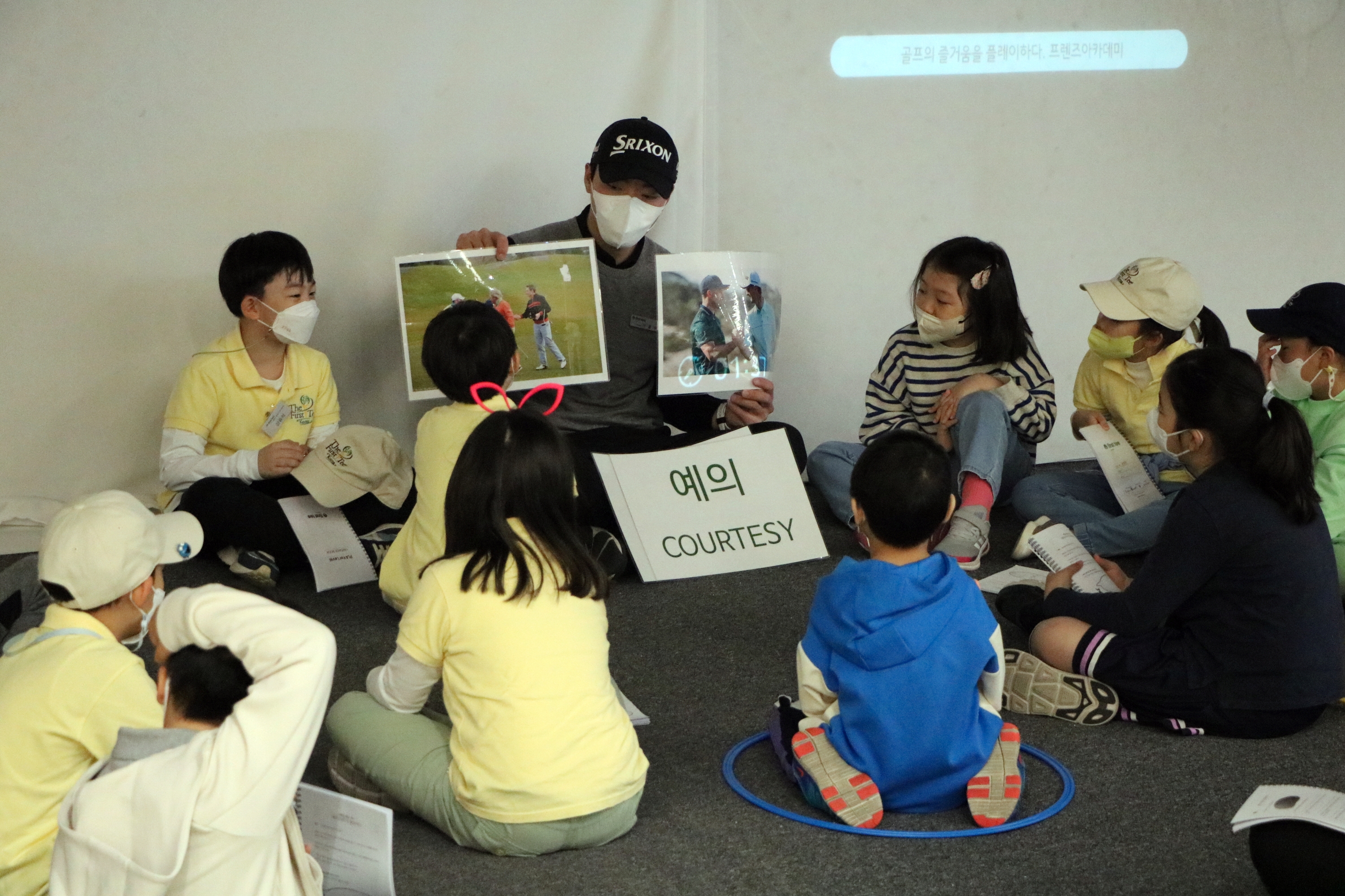 코스에서 지켜야 할 예의에 대해서 자료사진과 함께 설명해 주고 있는 모습