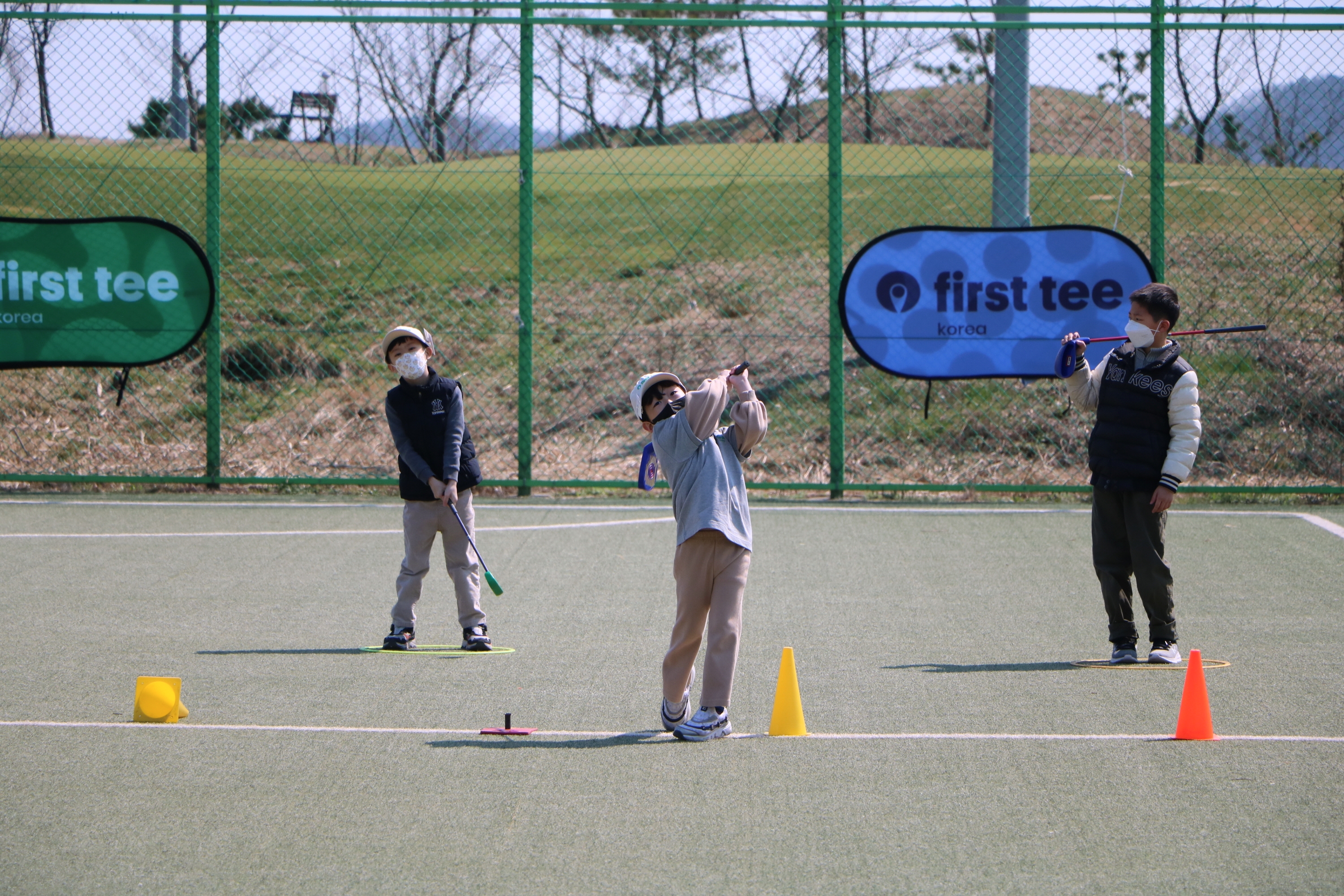 처음 골프를 배운 것임에도 불구하고 멋진 피니쉬 동작을 하고 있는 아이들