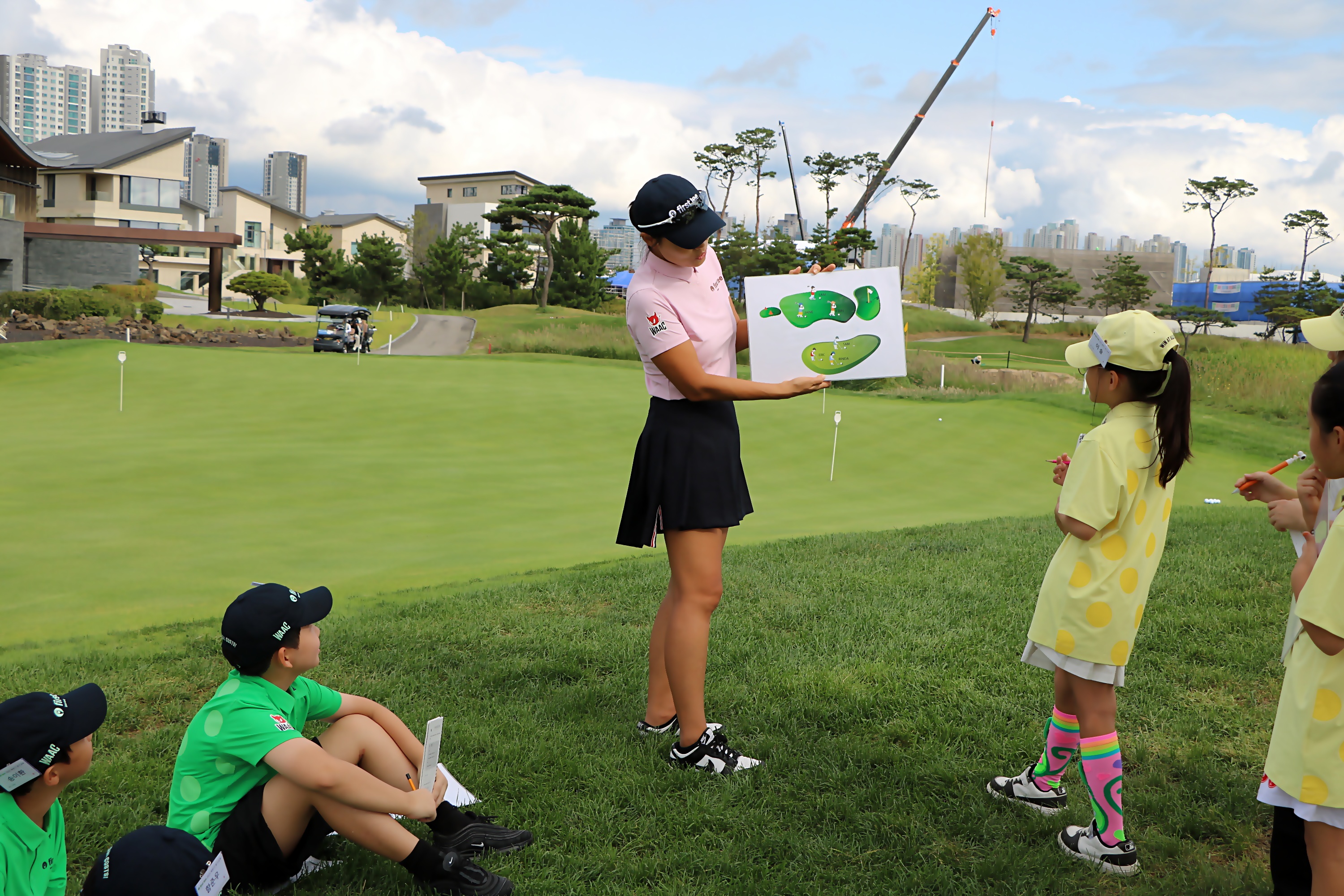 페어웨이 및 그린 위에서 지켜야 할 원구선타룰에 대해서 배우고 있는 아이들