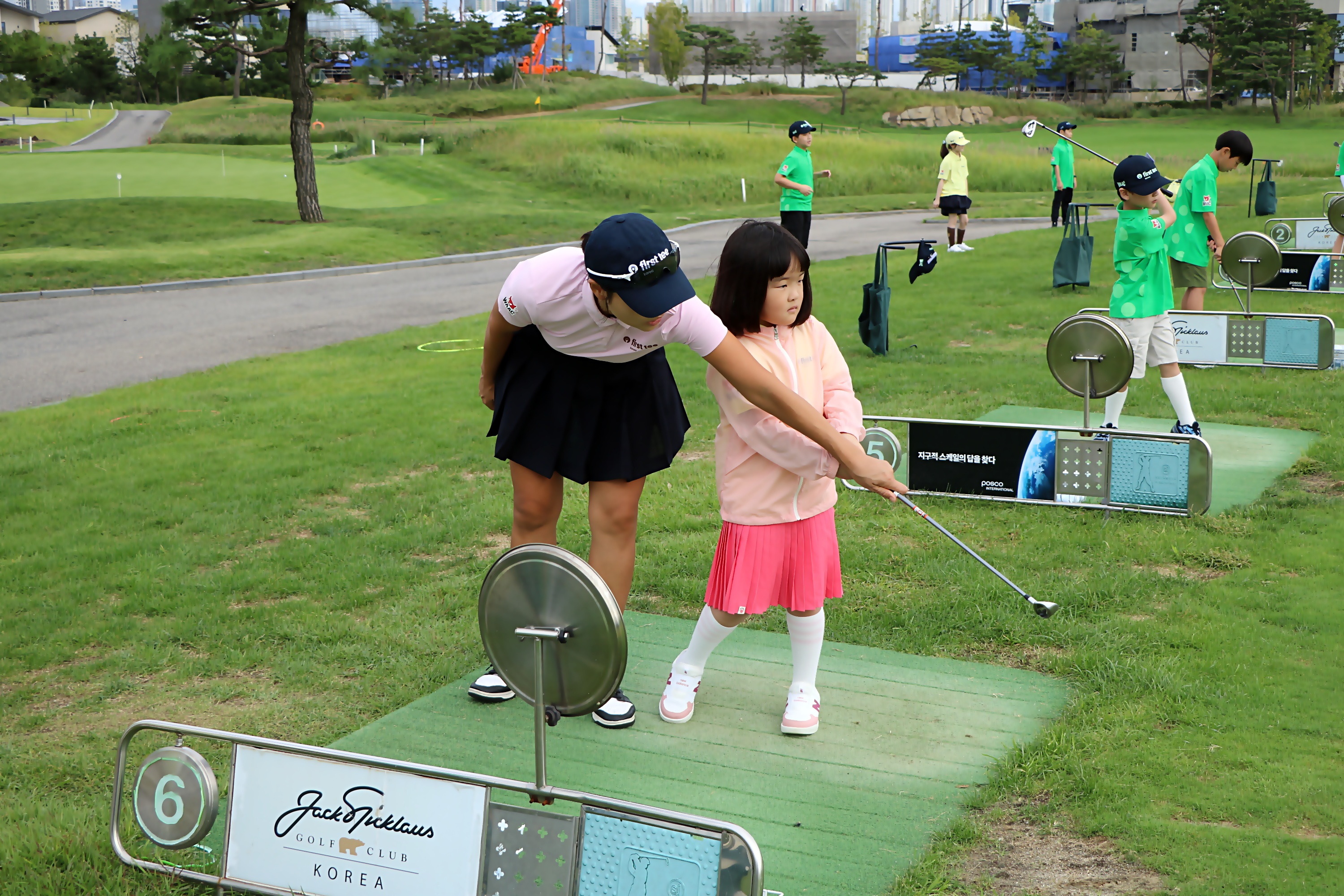 플레이어레벨 1단계 아이들을 위해 Y TO Y 스윙을 지도해 주는 모습