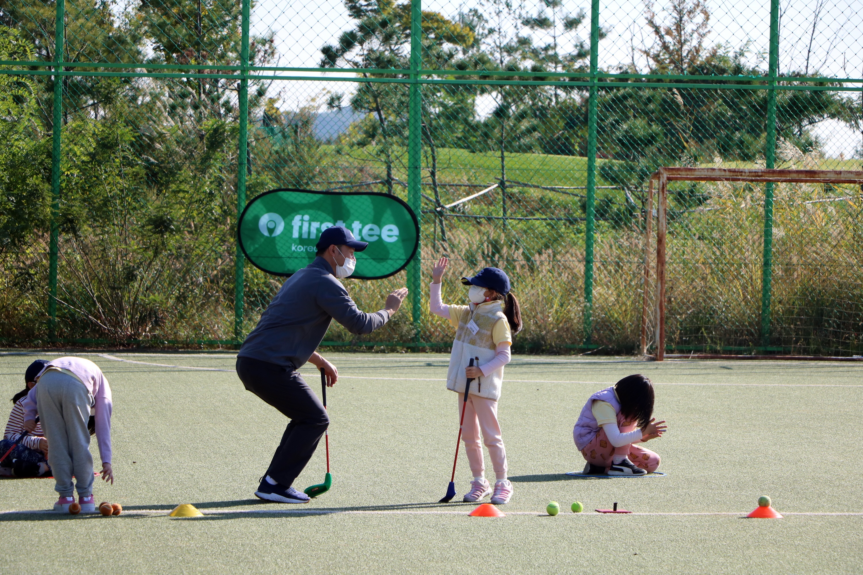 목표물을 맞춘 뒤 코치님과 하이파이브를 하며 즐거워하는 모습