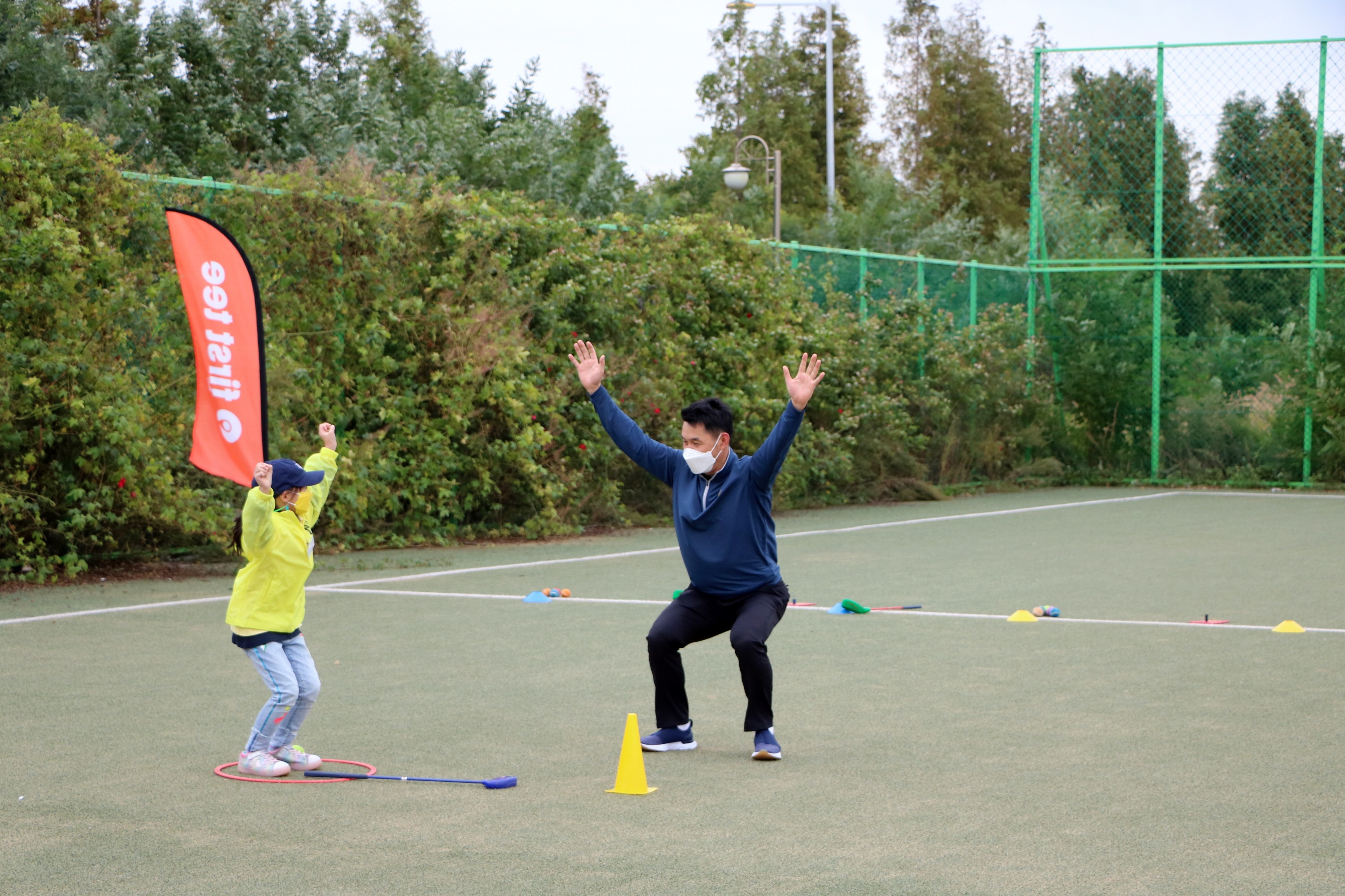 코치님을 따라서 스쿼트 동작을 하고 있는 모습