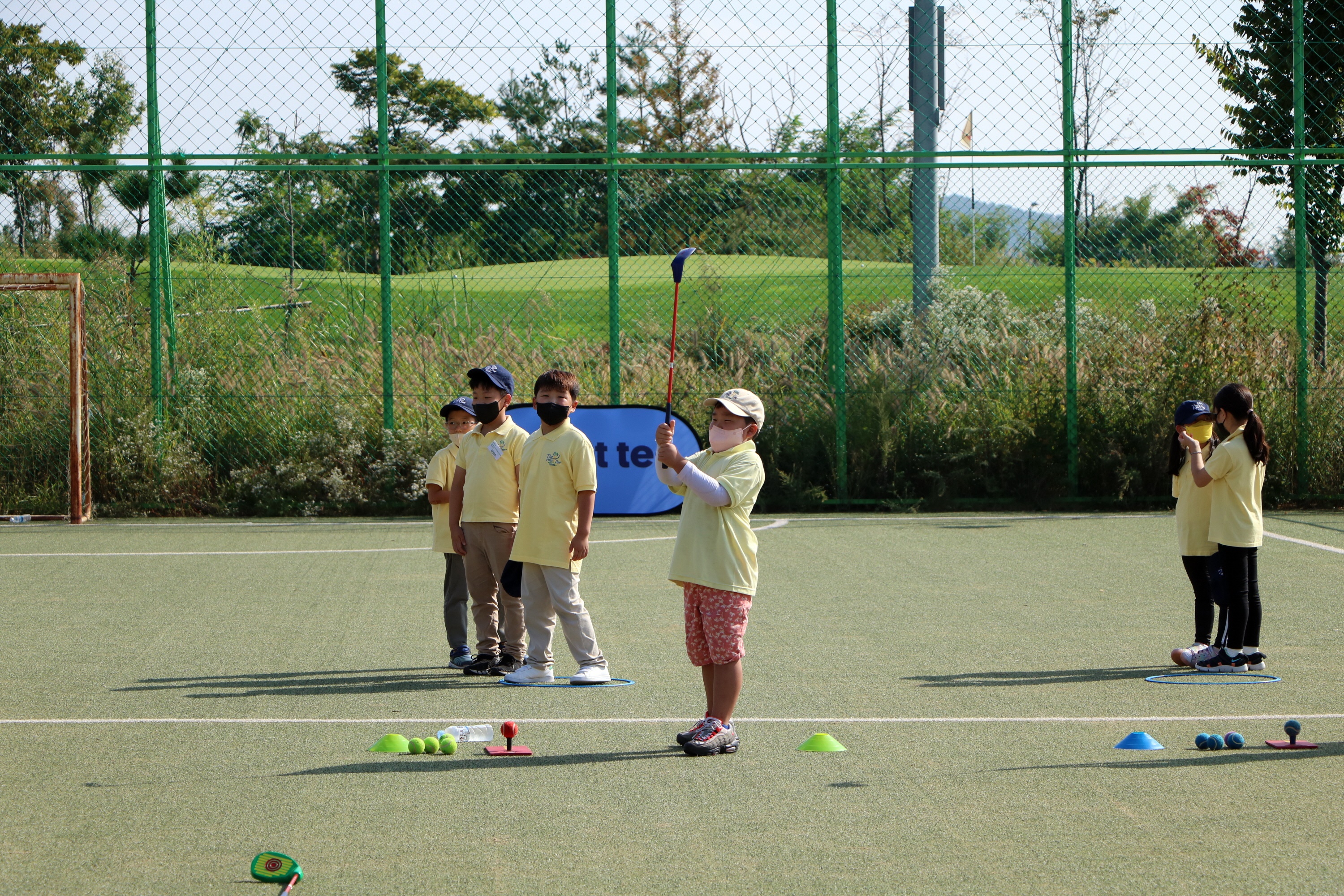 코치님의 지시에 따라 그립 잡는 법을 배우고 있는 아이들