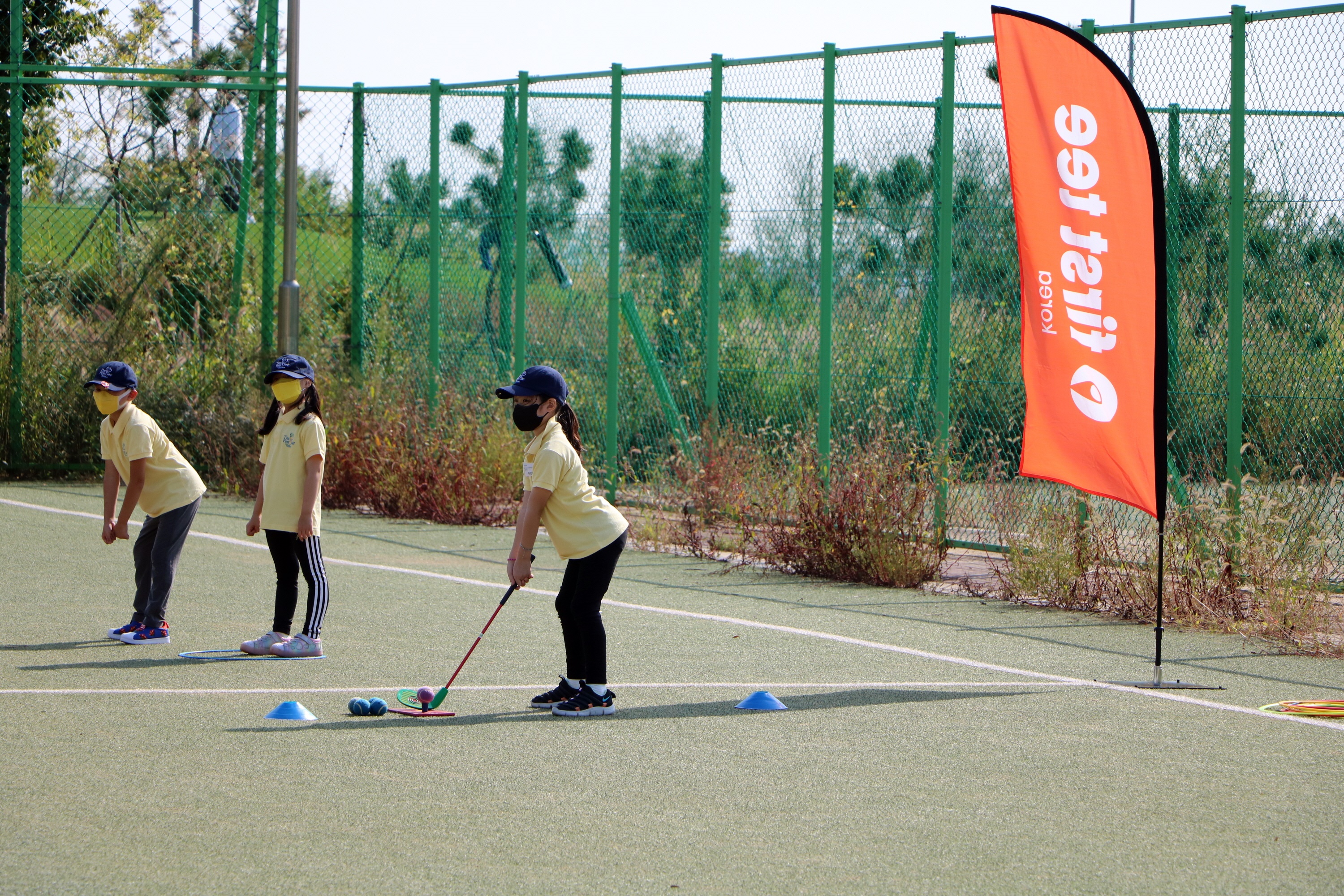 코치님을 따라 어드레스 자세를 취해보고 있는 아이들