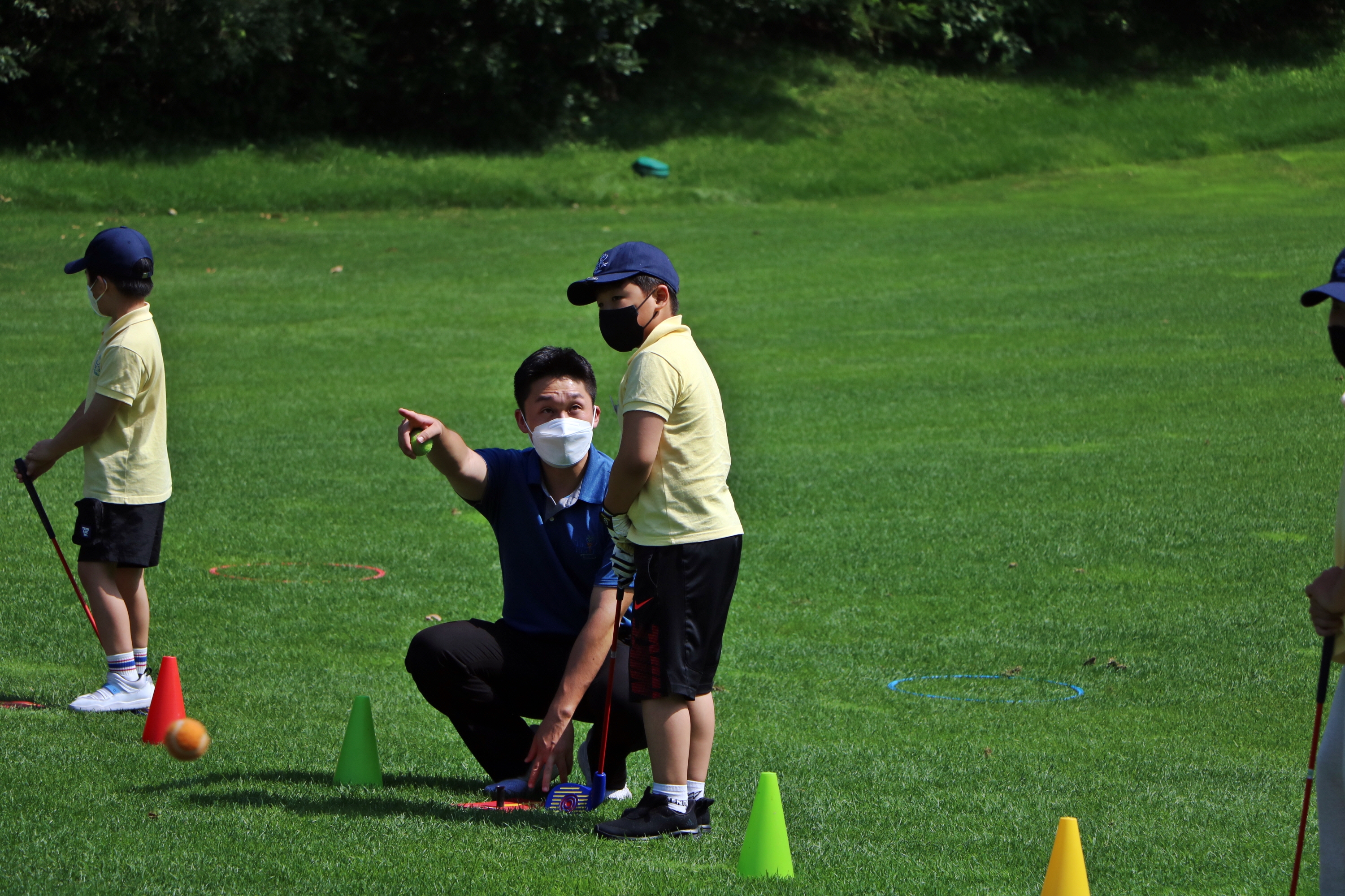 목표방향대로 어드레스를 잘 서야 함을 가르쳐 주고 있는 모습