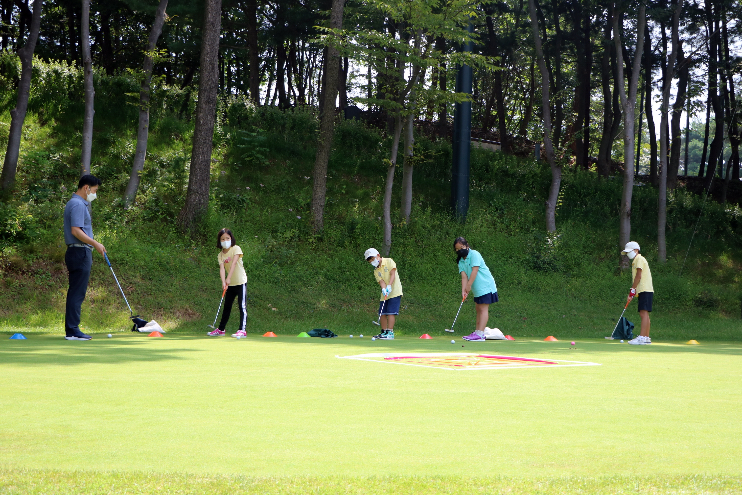 코치님과 함께 전방 타겟에 공을 넣는 퍼팅게임을 하고 있는 아이들