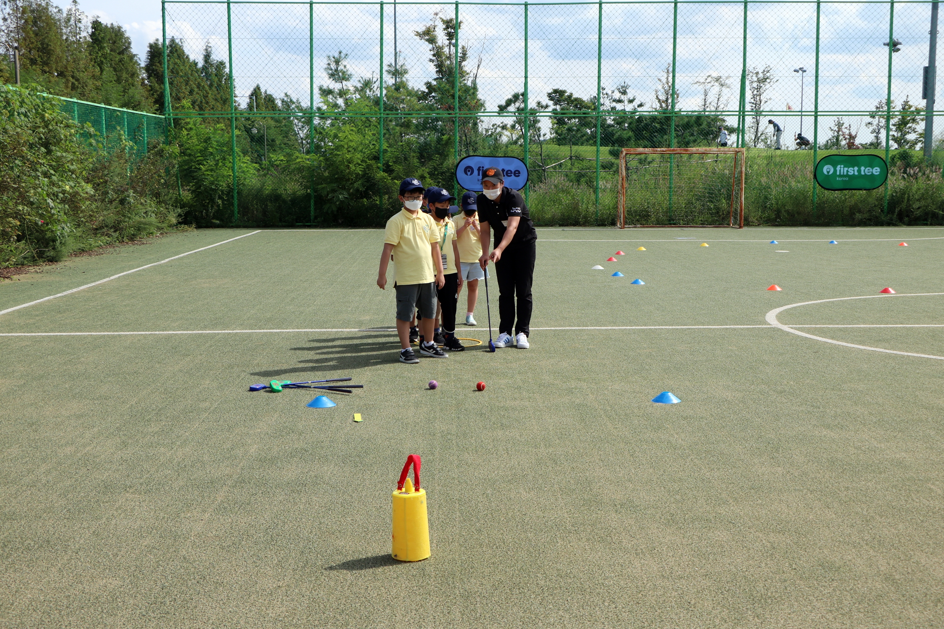 퍼팅시 1단계로 목표방향보는 방법에 대해서 설명해 주고 있는 모습