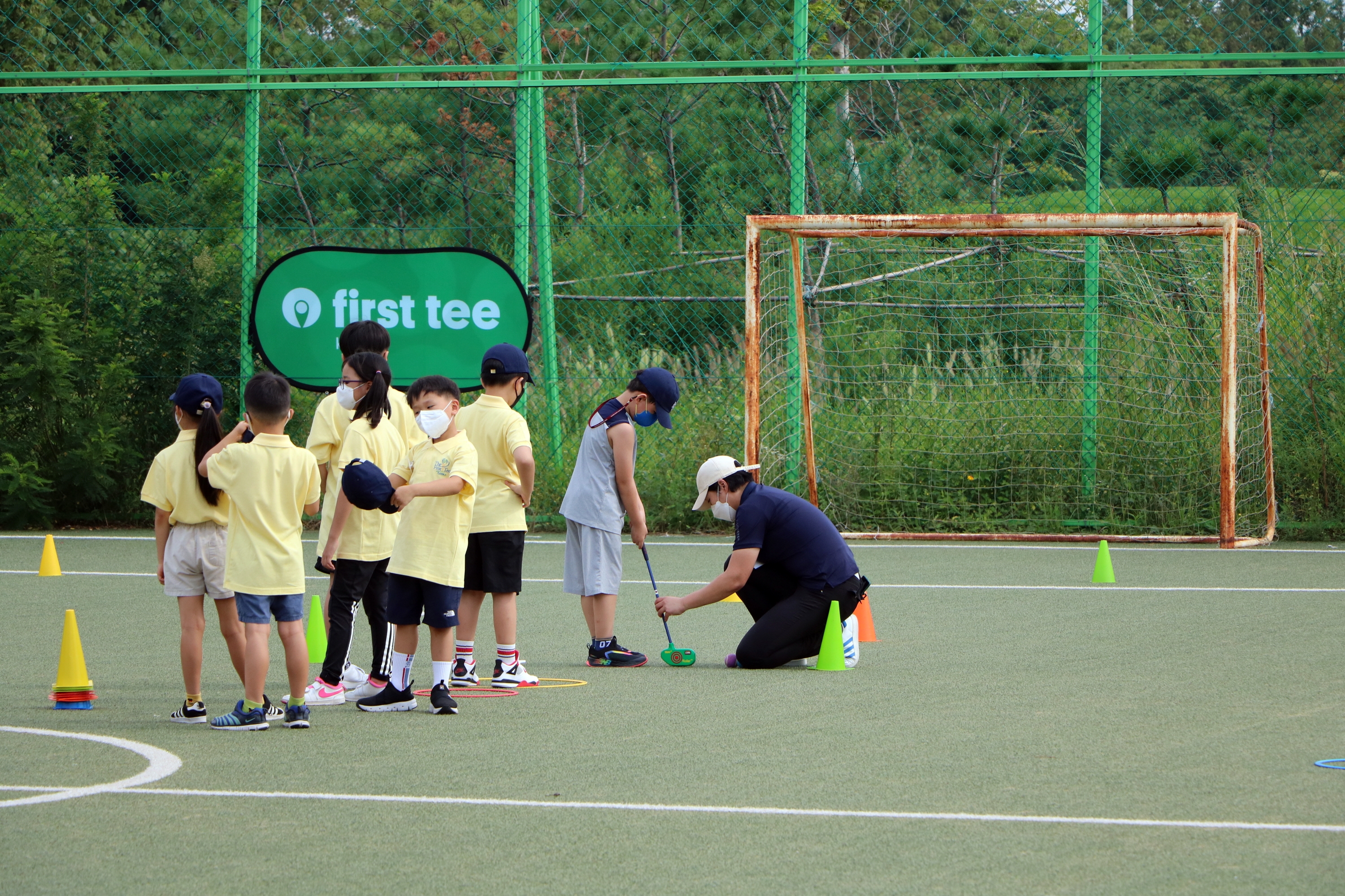아이들 눈높이로 열정적으로 퍼팅하는 요령에 대해서 설명해 주고 있는 코치님