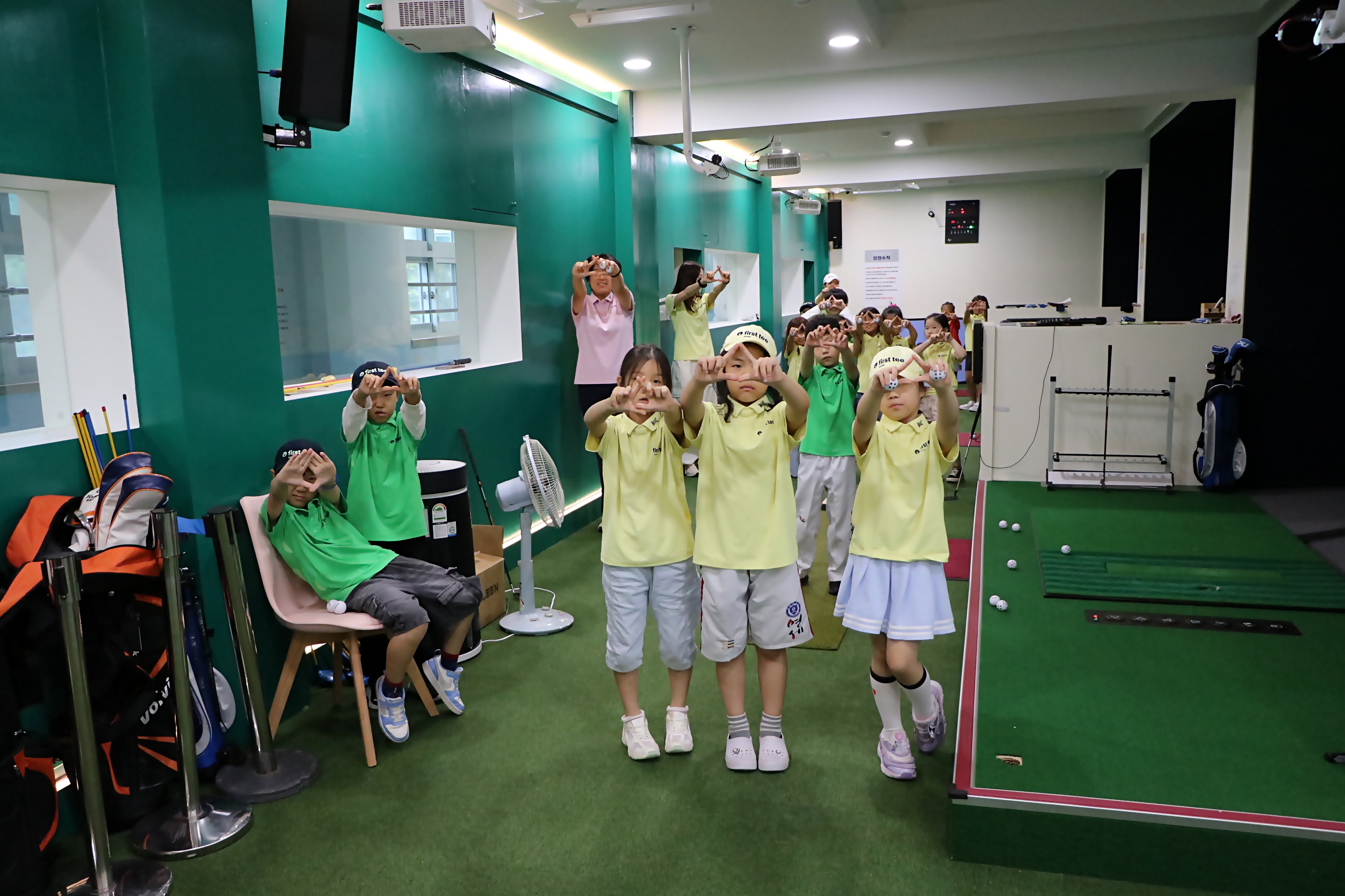 퍼팅할 때 자신의 주눈을 확인하는 방법을 가르쳐 주고 있는 모습