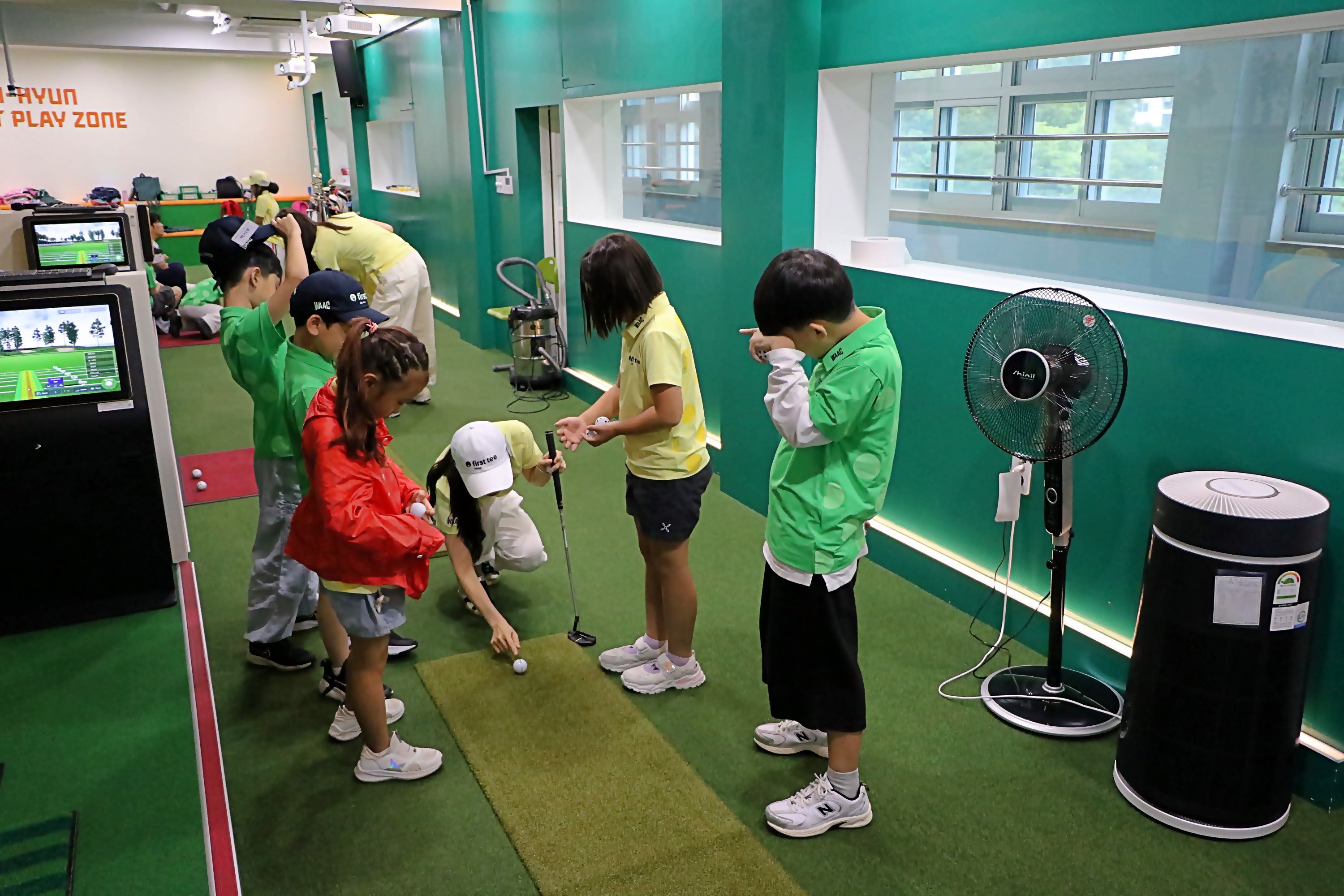 목표방향으로 올바르게 볼을 놓는 법을 가르쳐 주고 있는 모습
