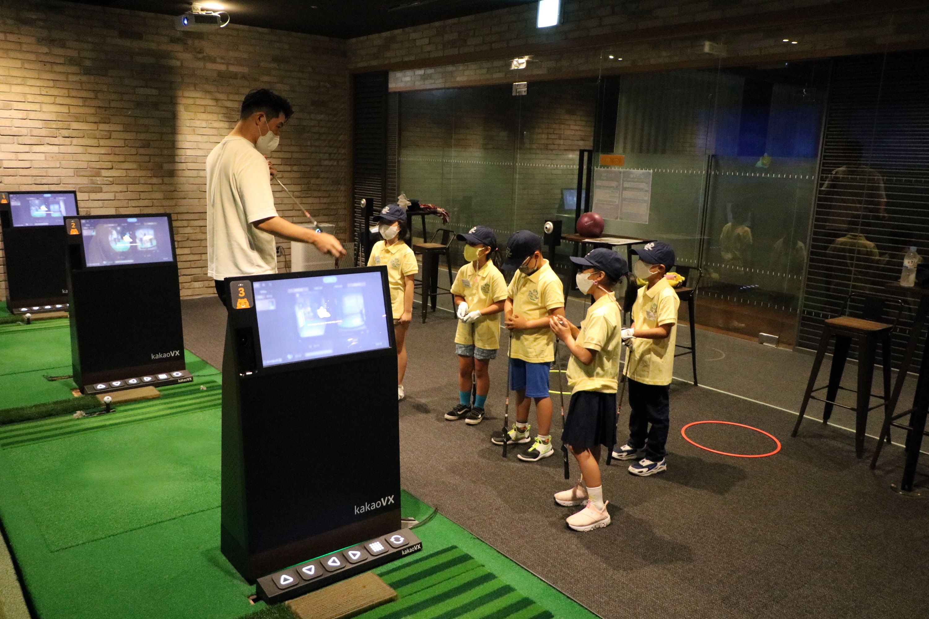 타석에서 골프실습을 하지 않을 때는 항상 안전을 위해 클럽 헤드를 잡아야 한다는 것을 설명해 주는 코치님