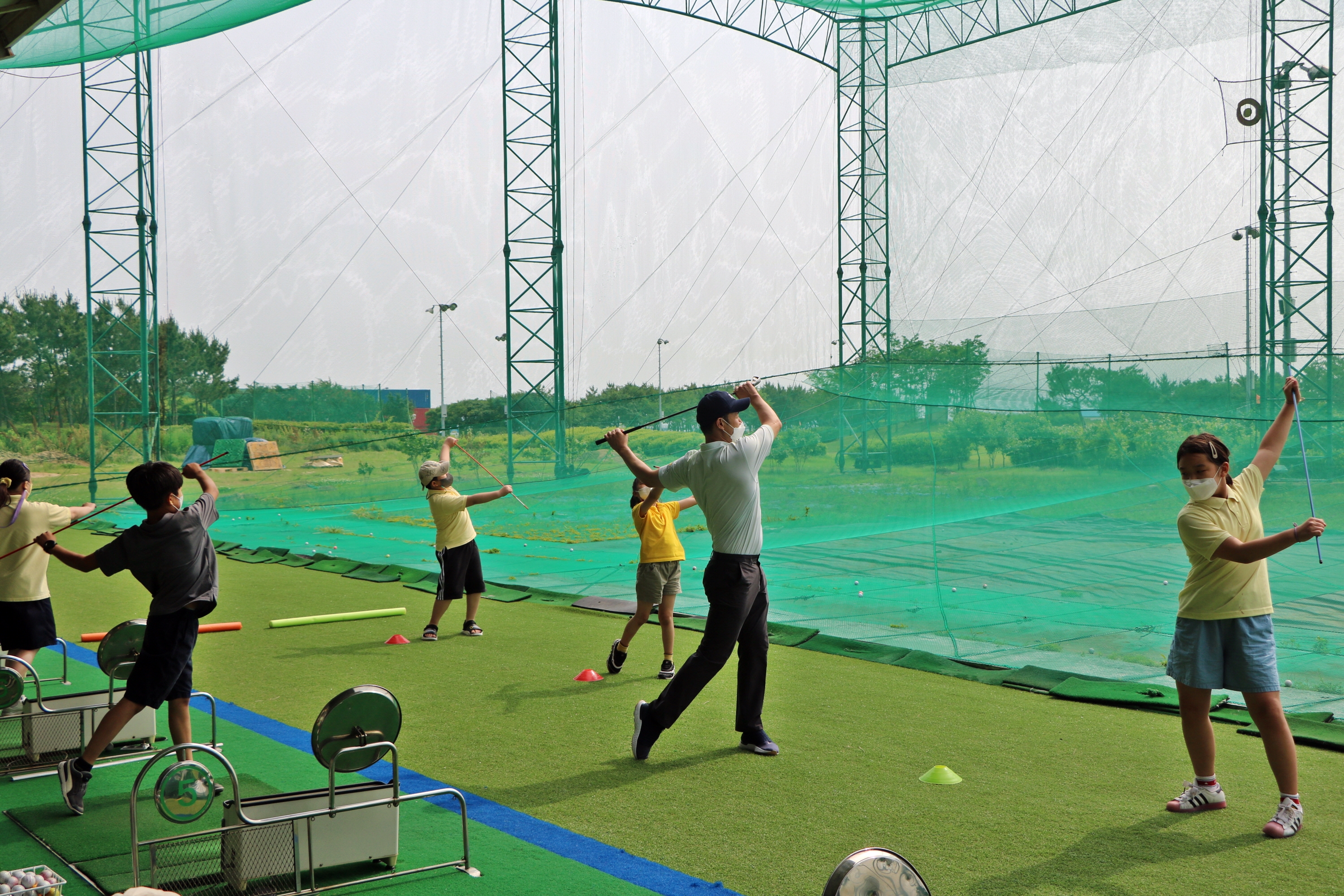샤프트를 들고 스윙의 리듬감에 대해서 익히고 있는 모습