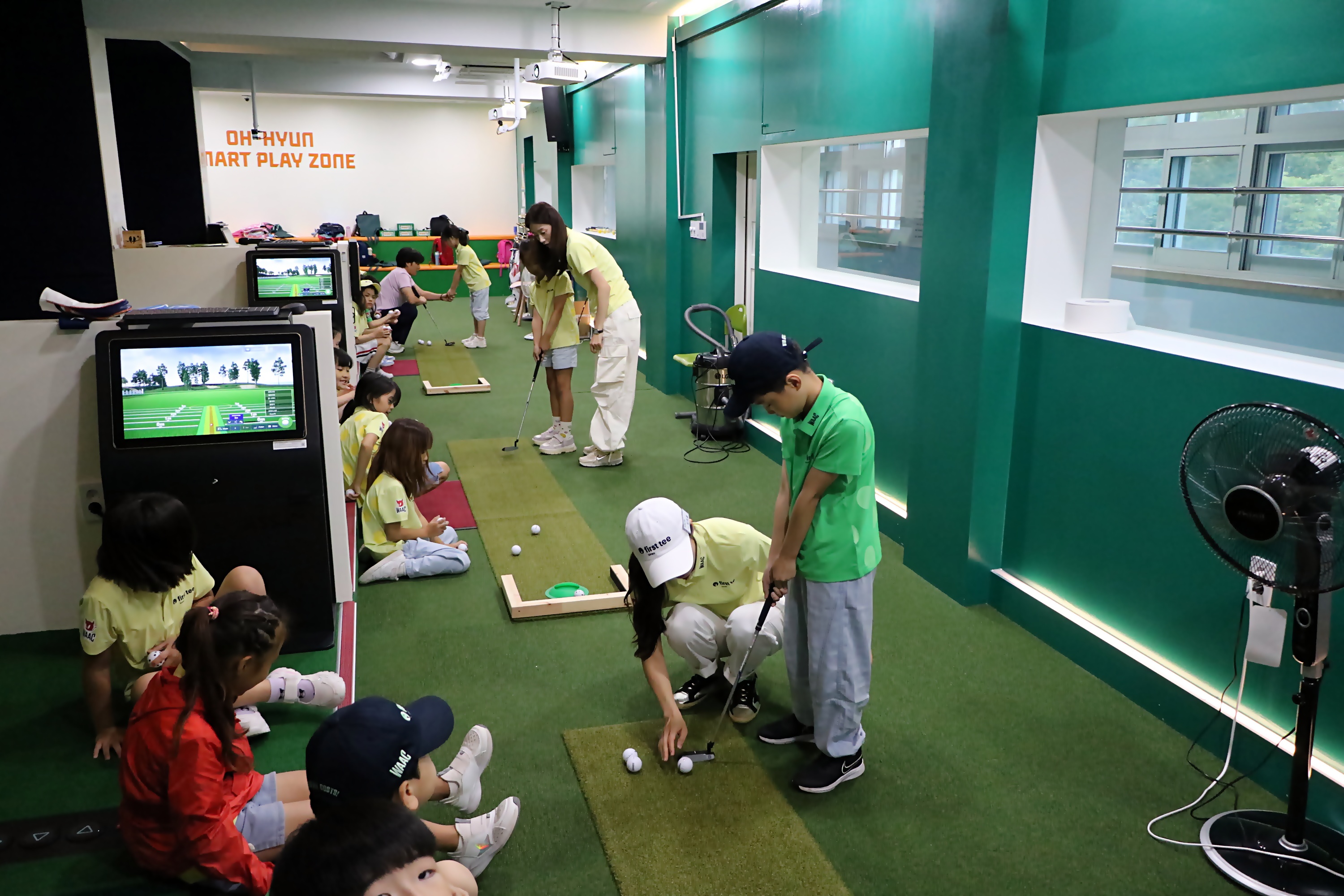 3개조로 나뉘어 개별 퍼팅레슨과 함께 실습을 하고 있는 아이들