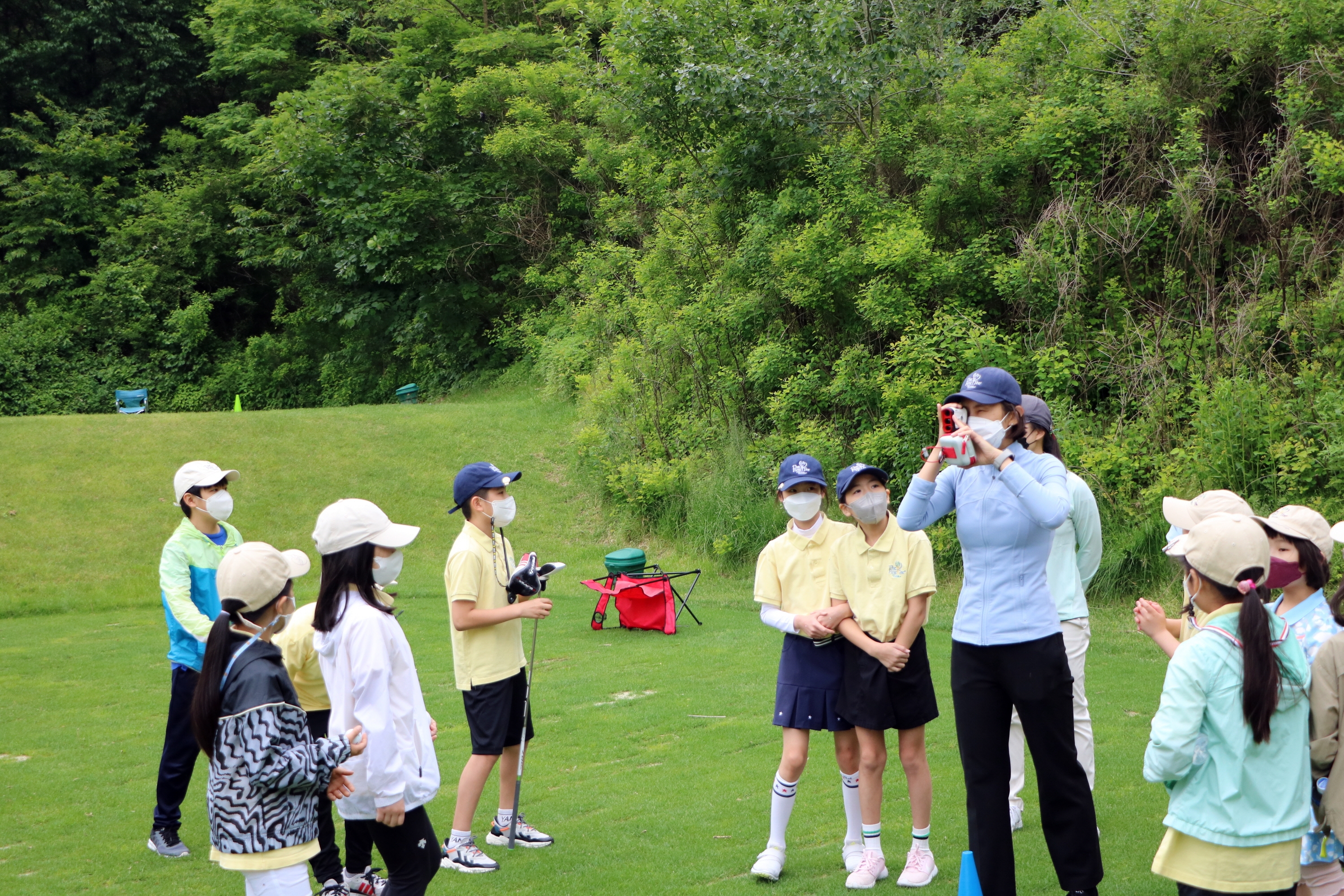 니어핀을 하기 전에 핀까지의 거리가 정확하게 얼마인지 거리측정기를 이용해 확인하고 있는 모습