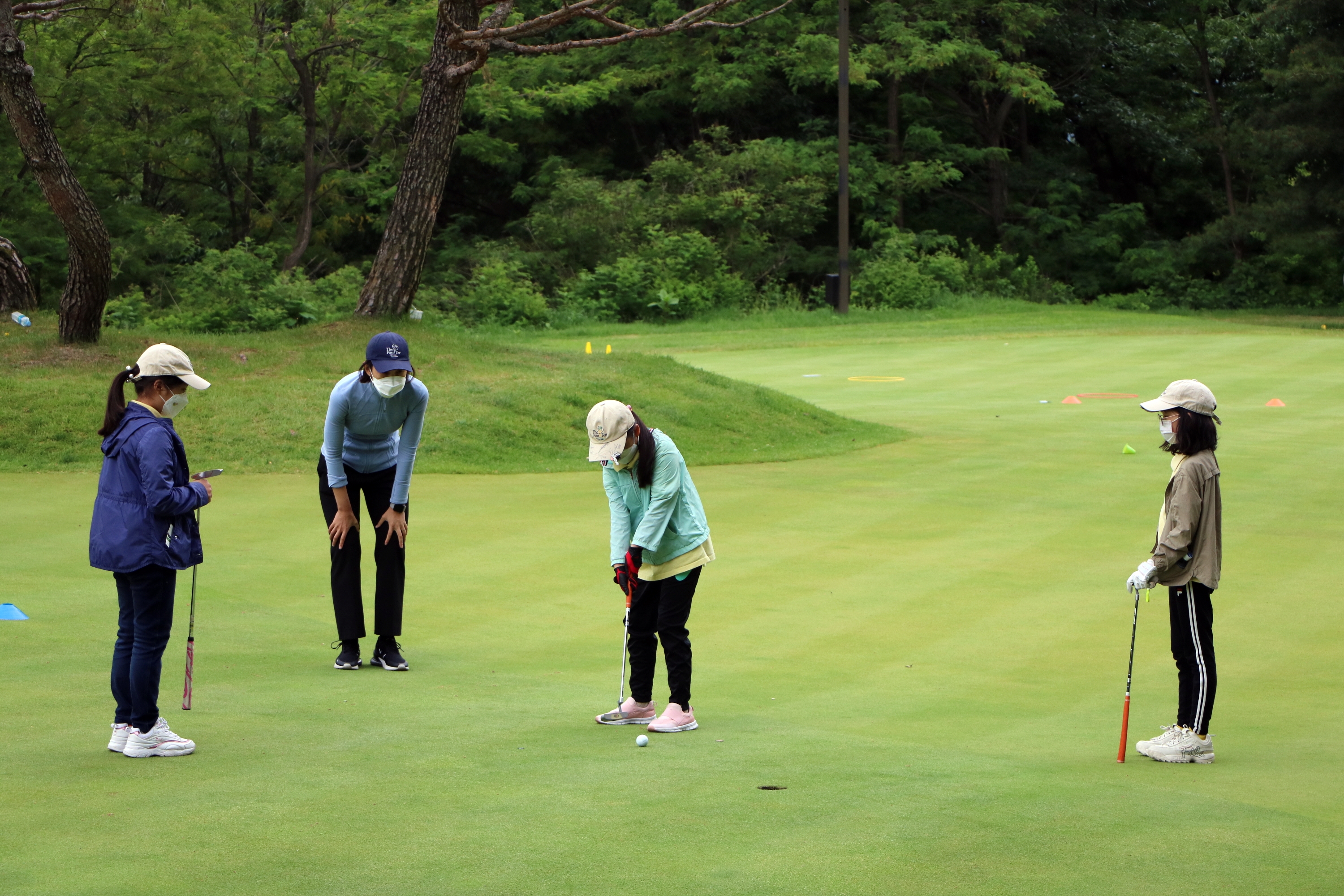 조별로 나뉘어 실제 그린 위에서 9홀 퍼팅 실습을 하고 있는 모습