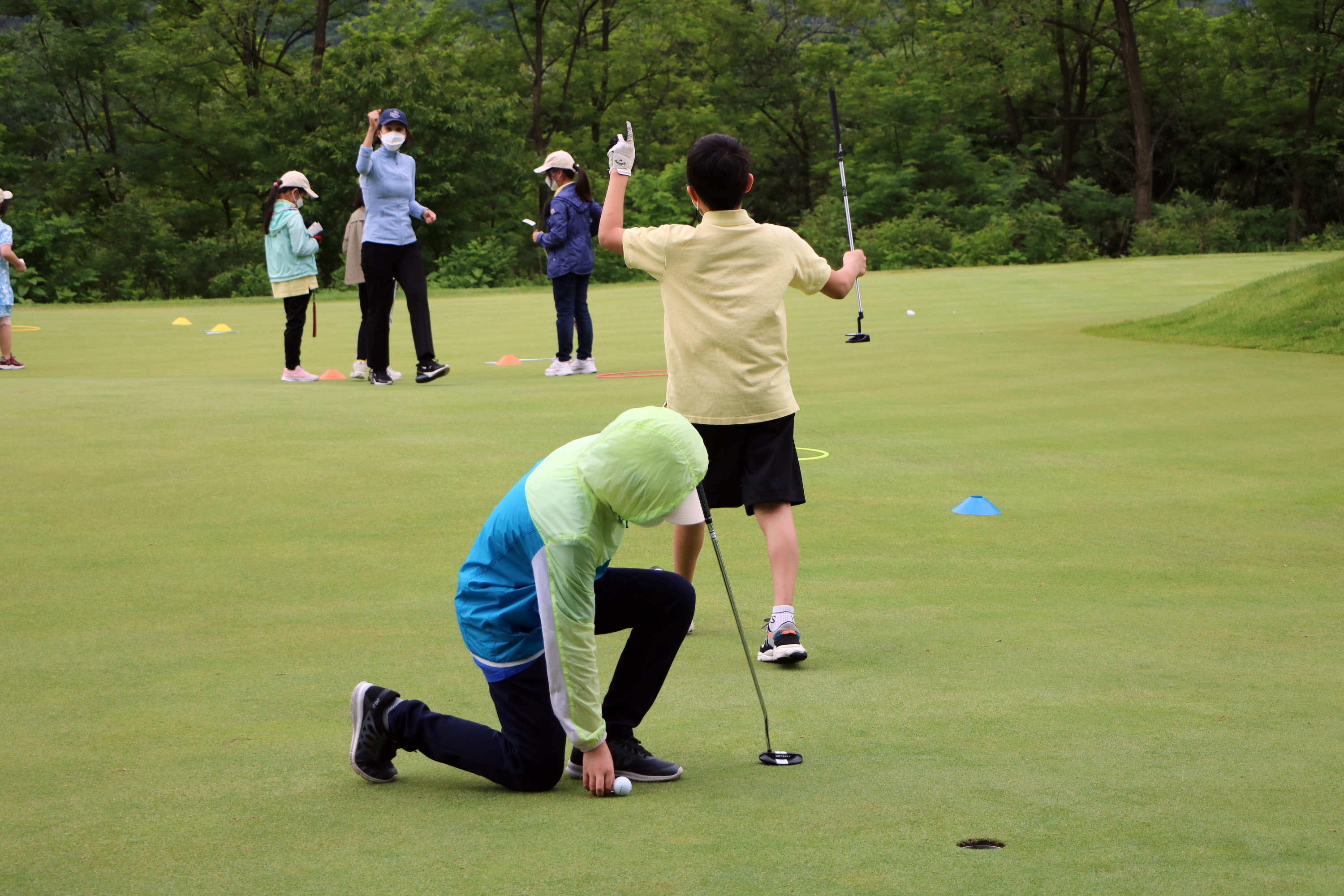 1퍼트 홀인에 성공한 뒤 환호하는 교육생과 이를 축하해 주는 코치님