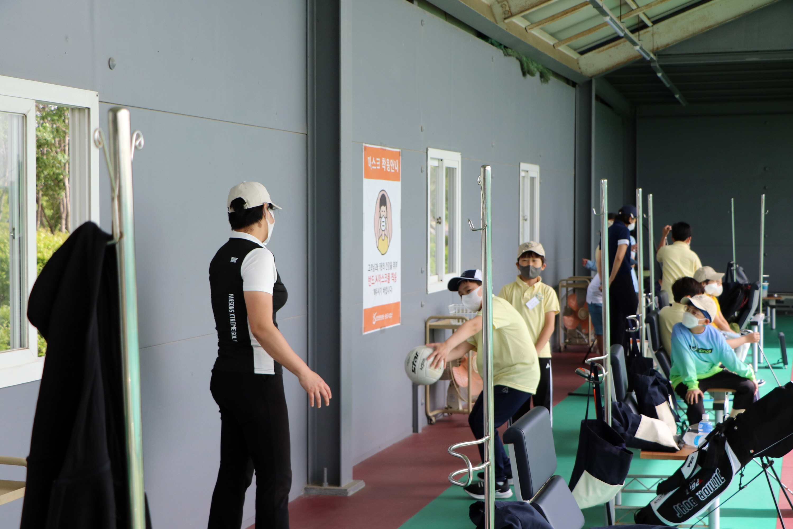 스윙감을 잃은 아이들을 대상으로 배구공을 이용해 리듬감을 가르쳐 주고 계신 자원봉사 중이신 어머니 골퍼