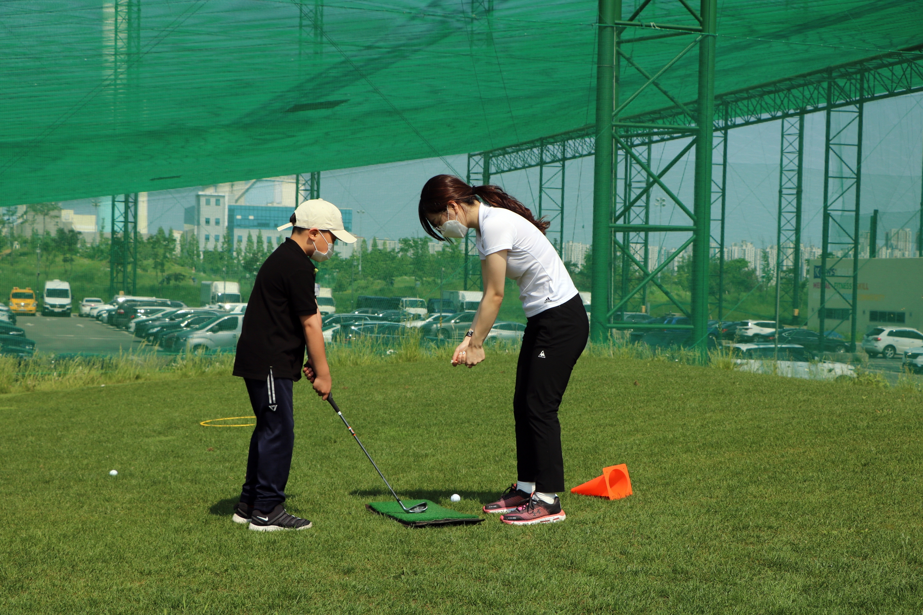 타구가 제대로 안맞자 곧바로 어드레스 자세부터 바로 잡아주고 있는 모습