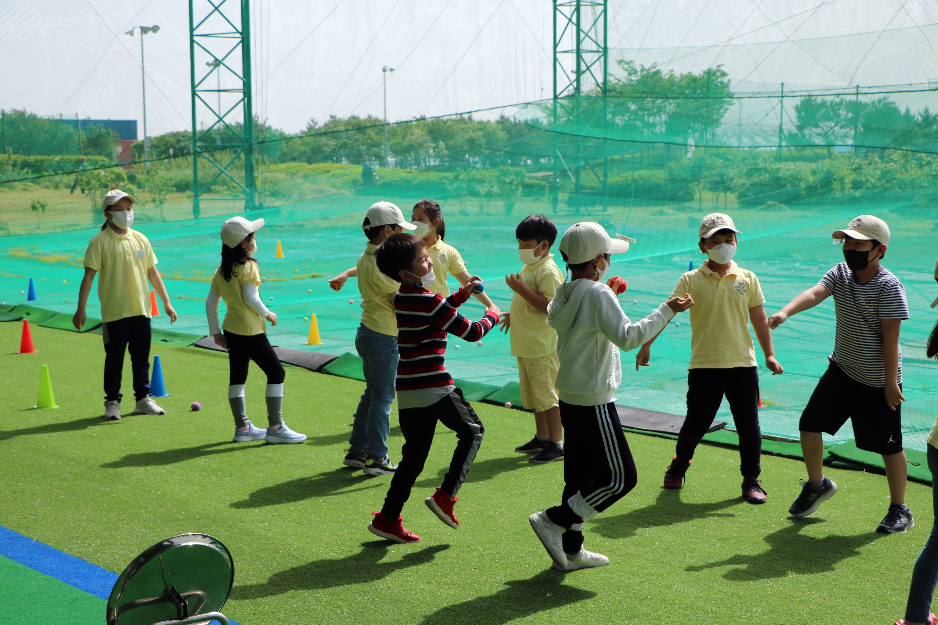 2인 1조로 코치님의 동작을 따라하다가 신호에 맞춰 먼저 공 줍는 게임을 하면서 순발력을 키우고 있는 아이들