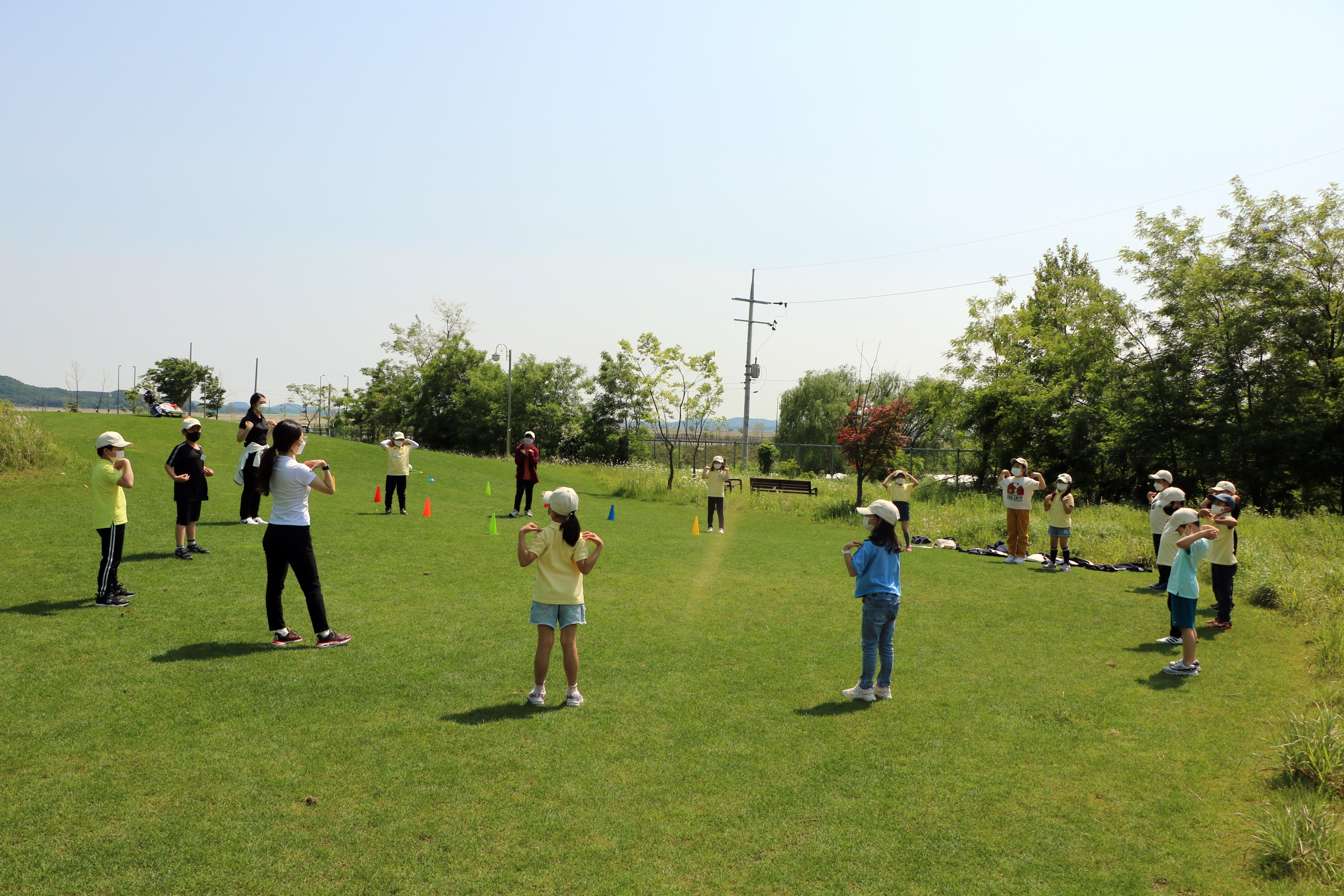 코치님의 구령에 맞춰 어깨돌리기를 하며 몸을 풀고 있는 아이들