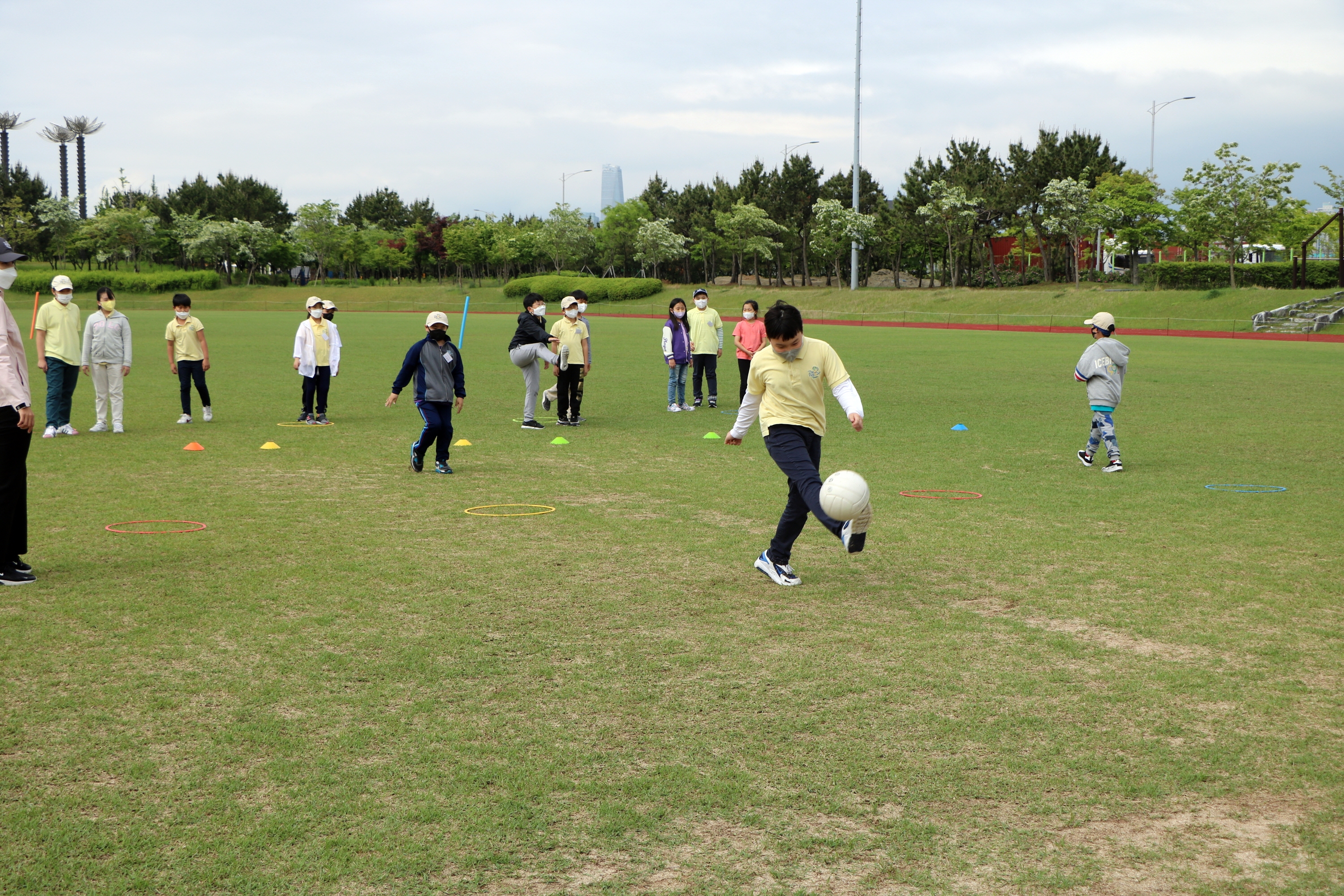 빨리 도착한 사람이 먼저 골대에 공을 차 넣으면 이기는 경기를 하며 몸을 풀고 있는 아이들