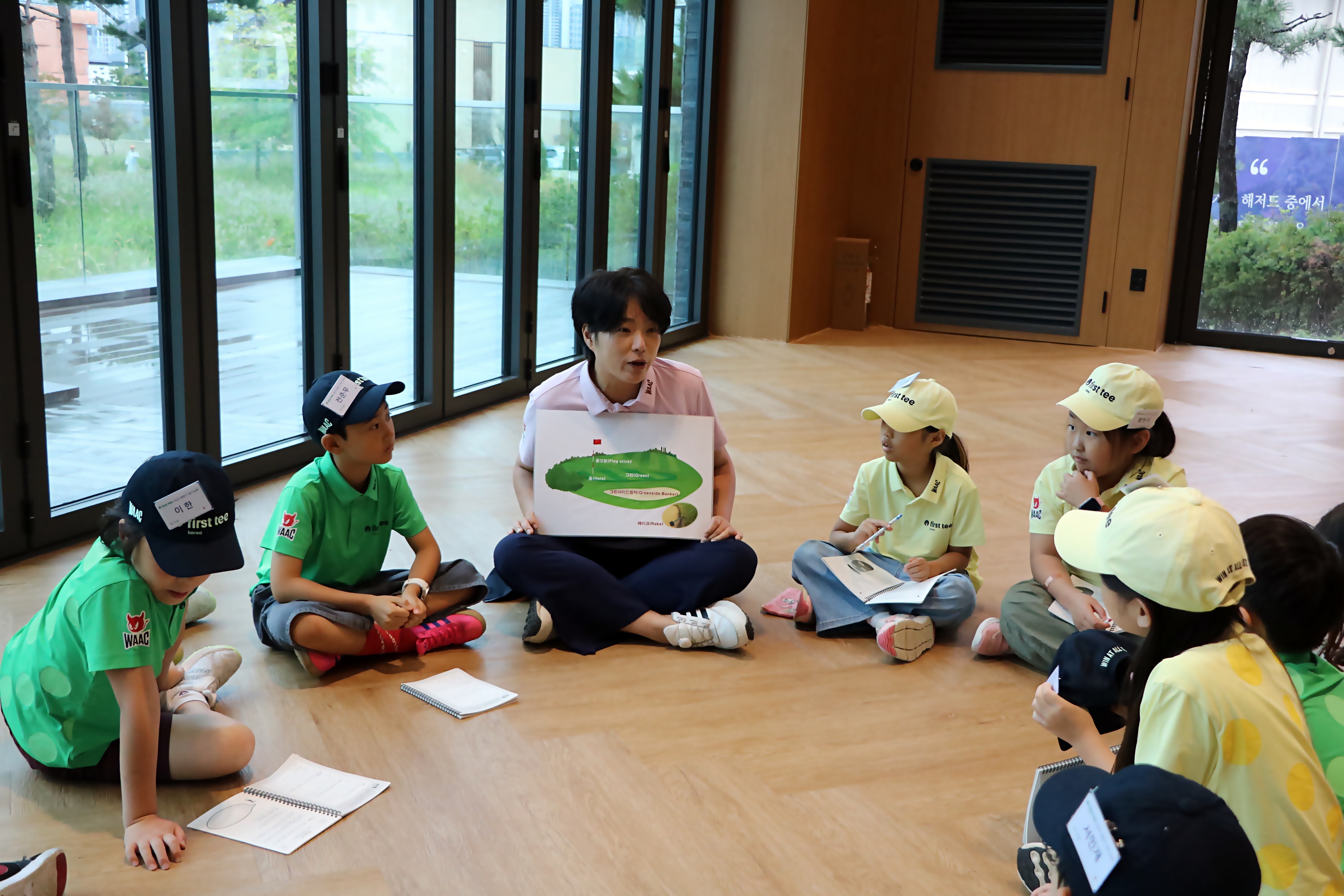 다음주 벙커샷 실습에 앞서 벙커에서 반드시 지켜야 할 주의사항에 대해서 설명해 주고 있는 모습