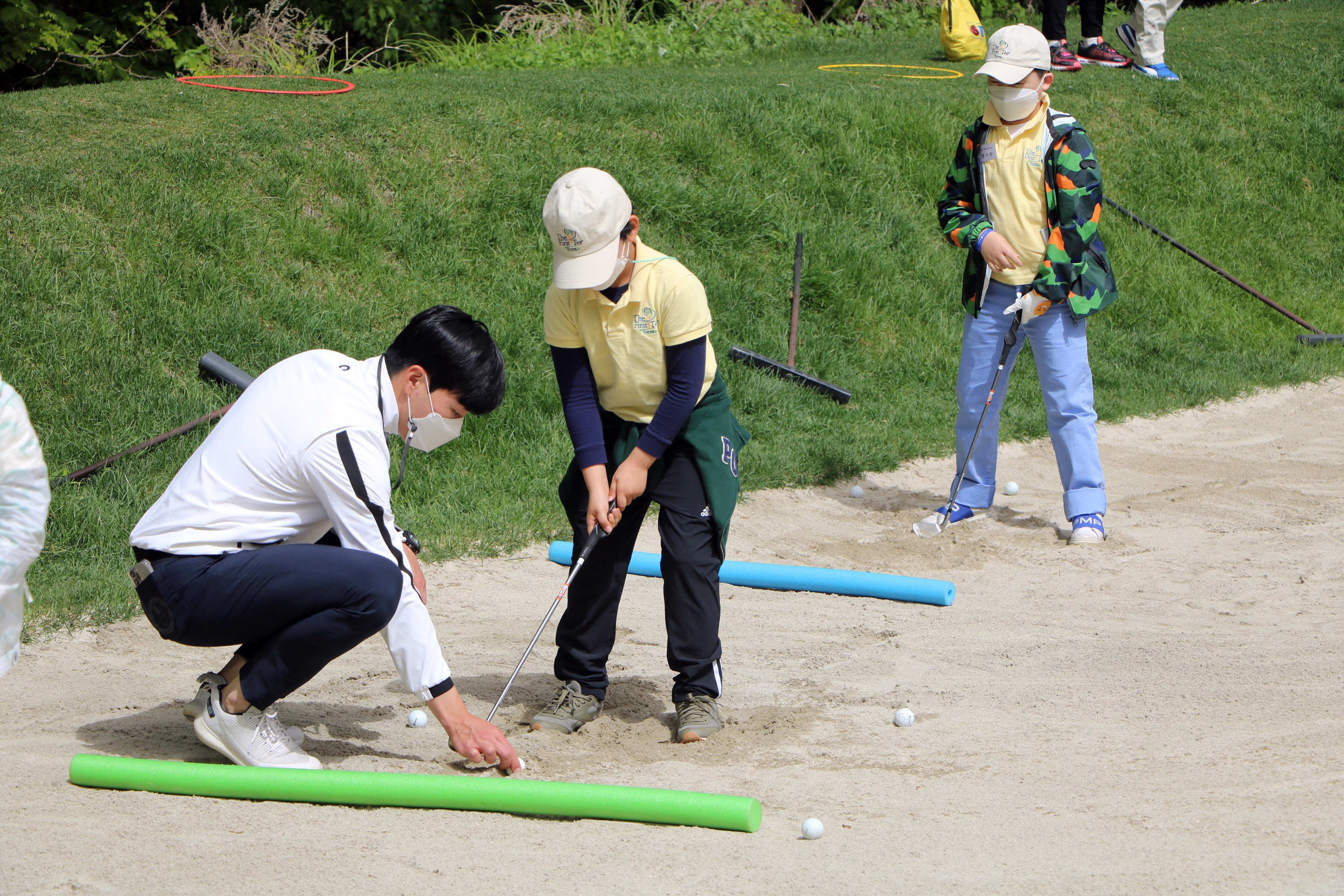 벙커샷하는 요령을 알기 쉽게 가르쳐 주고 있는 모습
